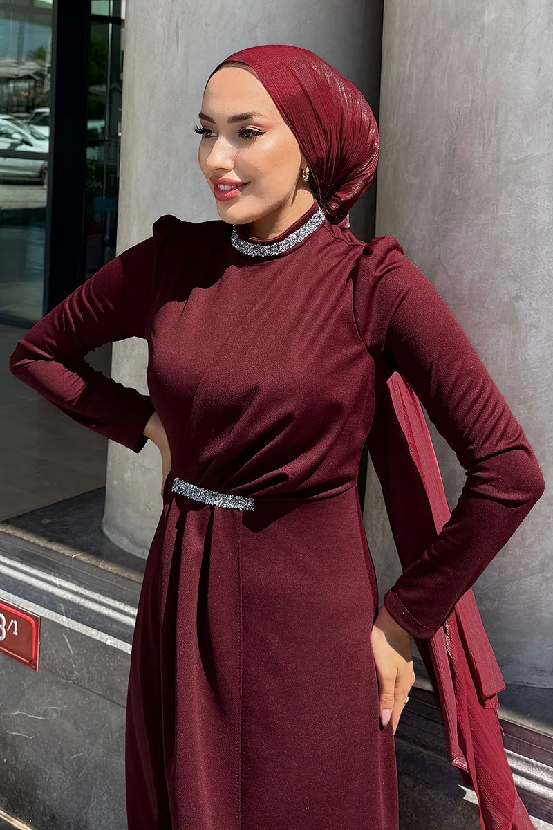 Product Name: Stone Detailed Crepe Evening Dress; this elegant hijab evening dress is a special design that can be chosen for all four seasons. It should only be dry cleaned. Made from knitted crepe fabric, this dress features a semi-mandarin collar and a zipper at the back. This model, which is unlined, contains elegant stone details and is presented in a size 36 sample. The stones are stick-on and enhance the elegance of the model.