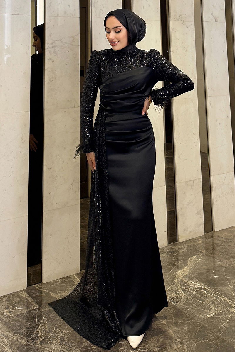 المنتج لديه ياقة نصف بيضوية. غير مبطنة. المنتج به سحاب في جزء من الخلف. يتم خياطة ريش الأوتريش في المنتج. المنتج يحتوي على حزام خصر مُخاط. تفاصيل الترتر اللامع تم خياطته قد يكون هناك اختلاف في الدرجة اللونية في المنتج بسبب التقاط الصور الفوتوغرافية.
