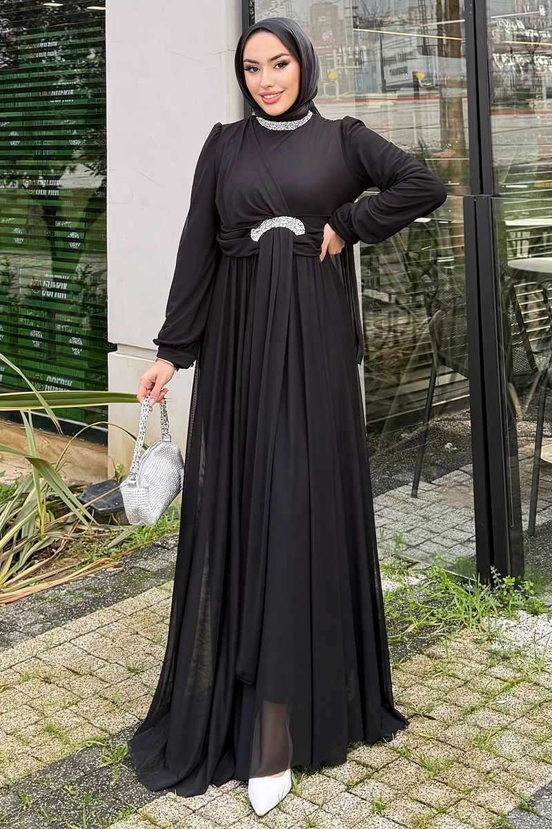 Elegant and chic, the Belted Stone Tulle Evening Gown is a suitable choice for all seasons with its modest design. This gown is made from superior quality tulle fabric and features a high-neck and lined details. It is zippered at the back and embellished with stone accessories that catch the eye, making it perfect for special occasions. Note: This product should only be dry cleaned. The product on the model is size 38.