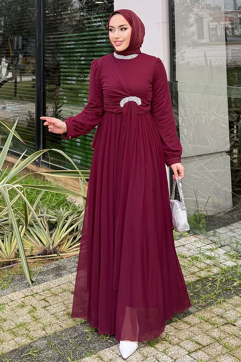 Elegant and chic, the Belted Stone Tulle Evening Gown is a suitable choice for all seasons with its modest design. This gown is made from superior quality tulle fabric and features a high-neck and lined details. It is zippered at the back and embellished with stone accessories that catch the eye, making it perfect for special occasions. Note: This product should only be dry cleaned. The product on the model is size 38.