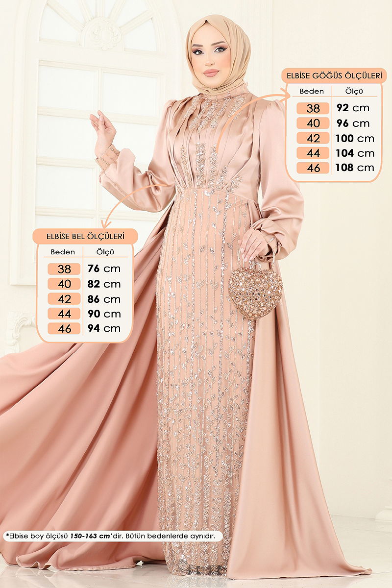 SUAL Draped Cape Evening Dress is a hijab-style product. It can be used in all four seasons. Only dry cleaning is required. Made of jeweled satin fabric. The product has a mandarin collar. It is lined. The product has a back zipper. (The product on the model is size 38.) The sequin detail is sewn. Bead details are riveted. The chiffon cape detail is sewn.