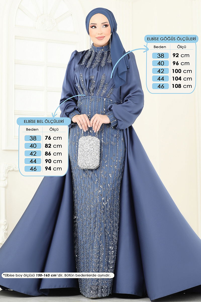 SUAL Draped Cape Evening Dress is a hijab-style product. It can be used in all four seasons. Only dry cleaning is required. Made of jeweled satin fabric. The product has a mandarin collar. It is lined. The product has a back zipper. (The product on the model is size 38.) The sequin detail is sewn. Bead details are riveted. The chiffon cape detail is sewn.
