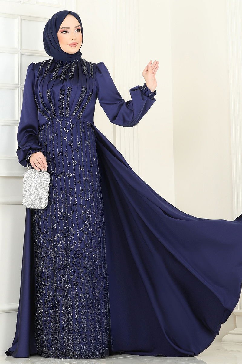 SUAL Draped Cape Evening Dress is a hijab-style product. It can be used in all four seasons. Only dry cleaning is required. Made of jeweled satin fabric. The product has a mandarin collar. It is lined. The product has a back zipper. (The product on the model is size 38.) The sequin detail is sewn. Bead details are riveted. The chiffon cape detail is sewn.