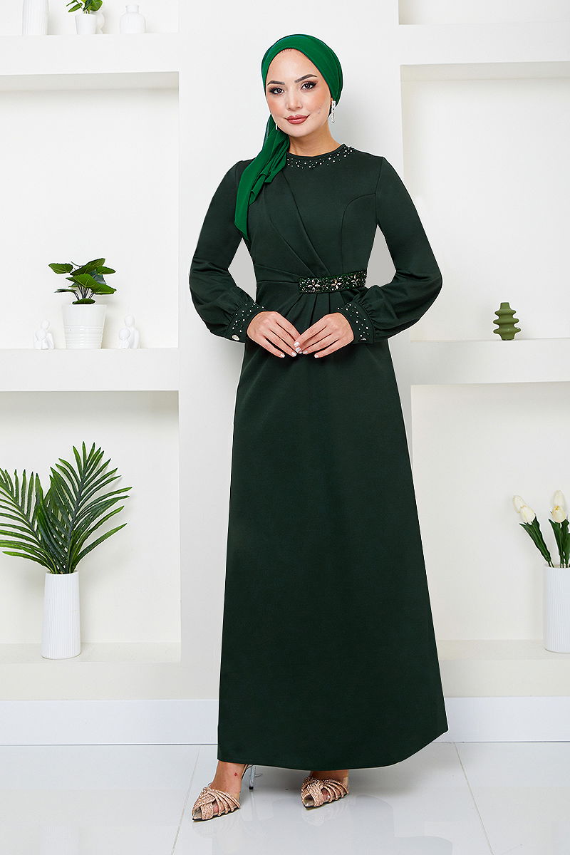 Beli Taş Embellished Abaya is a modest wear model that can be used in all seasons. It is recommended for dry cleaning only. It is made of first-class knitted dabil fabric. The product has a bicycle collar cut and is lining-free. It has a back zipper and the product on the model is size 38. The embellishments are not glued on and the cuff buttons are active.