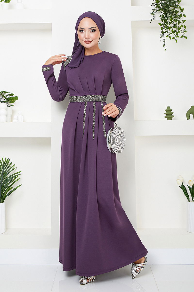 Belt Stone Embellished Evening Dress is a model of hijab clothing. It can be used in all four seasons. Dry cleaning only. It is made of first class Knit Dabıl fabric. The product has a Bicycle neck. Unlined. The product has a back zippered. (The product on the model is 38 size) Stones are not glued.