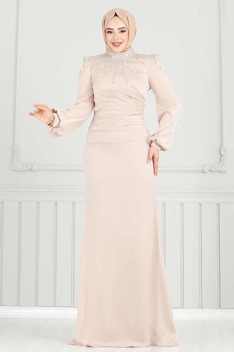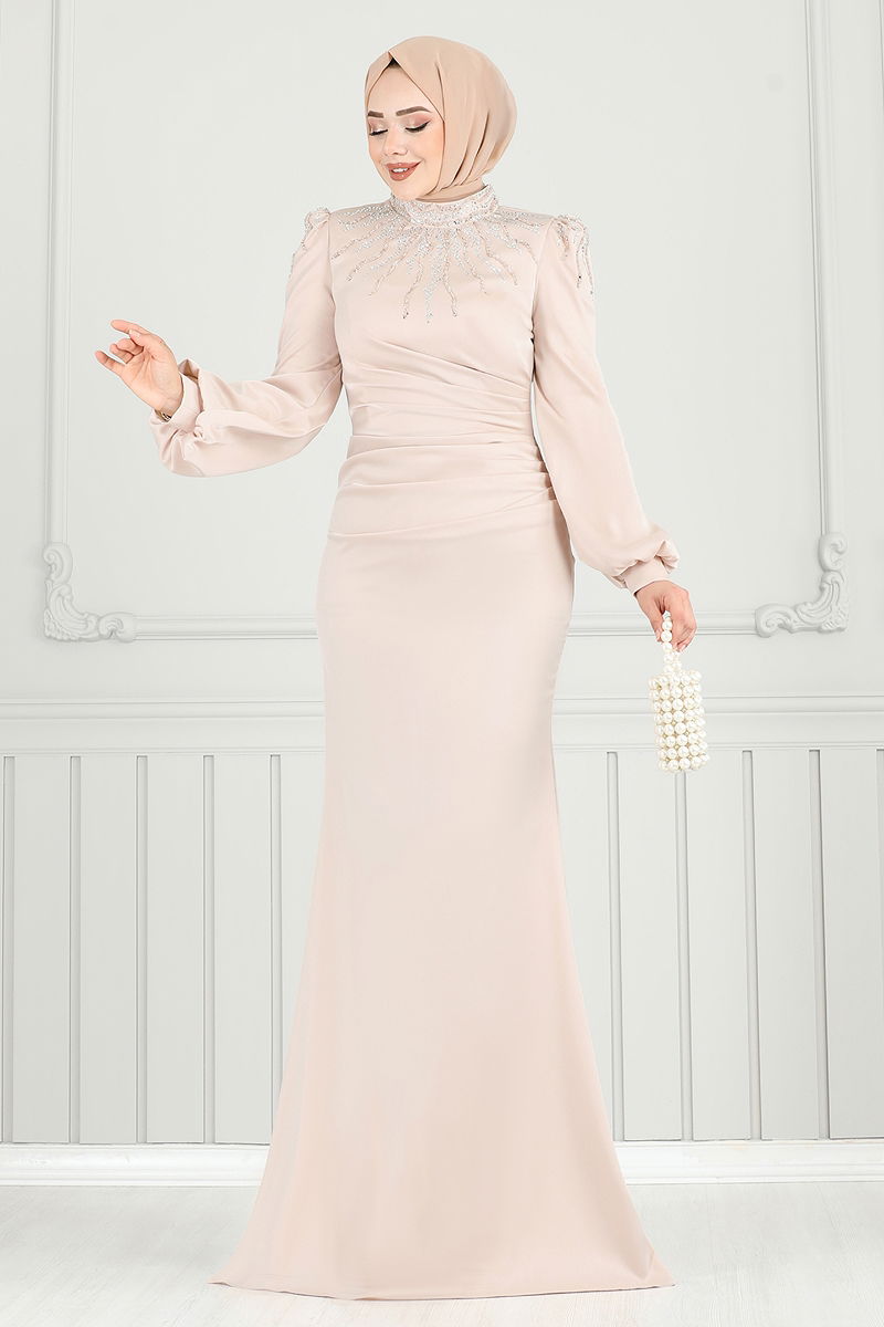 المنتج لديه ياقة بيضوية. مبطنة. المنتج به سحاب في جزء من الخلف. يتم لصق الحجارة. تفاصيل الخرز مخيطة. قد يكون هناك اختلاف في الدرجة اللونية في المنتج بسبب التقاط الصور الفوتوغرافية.