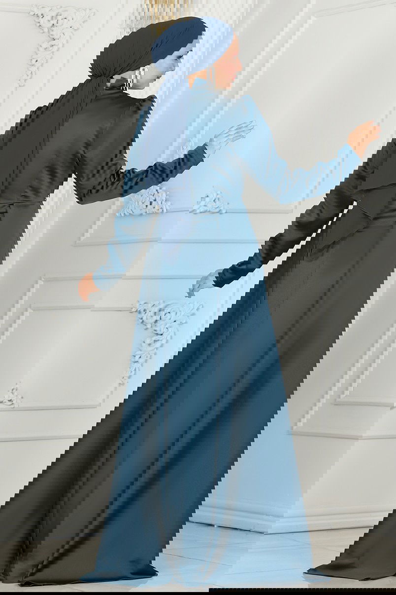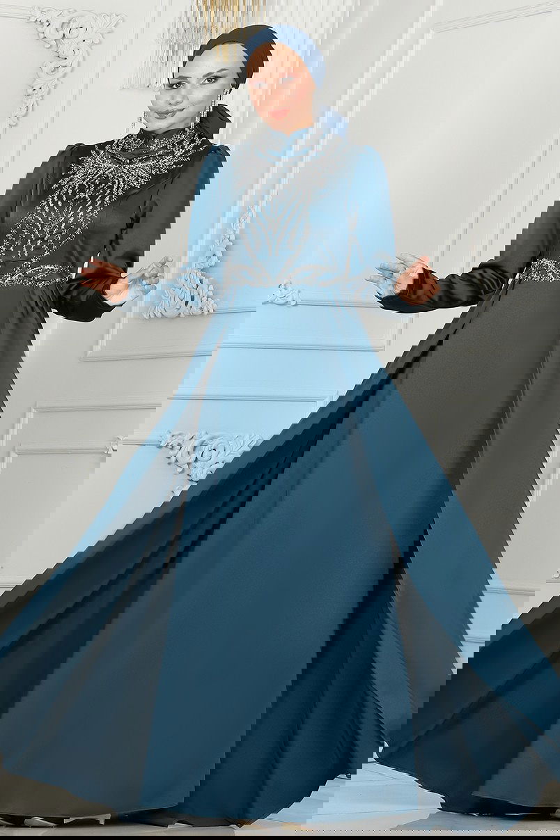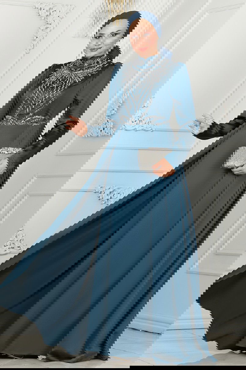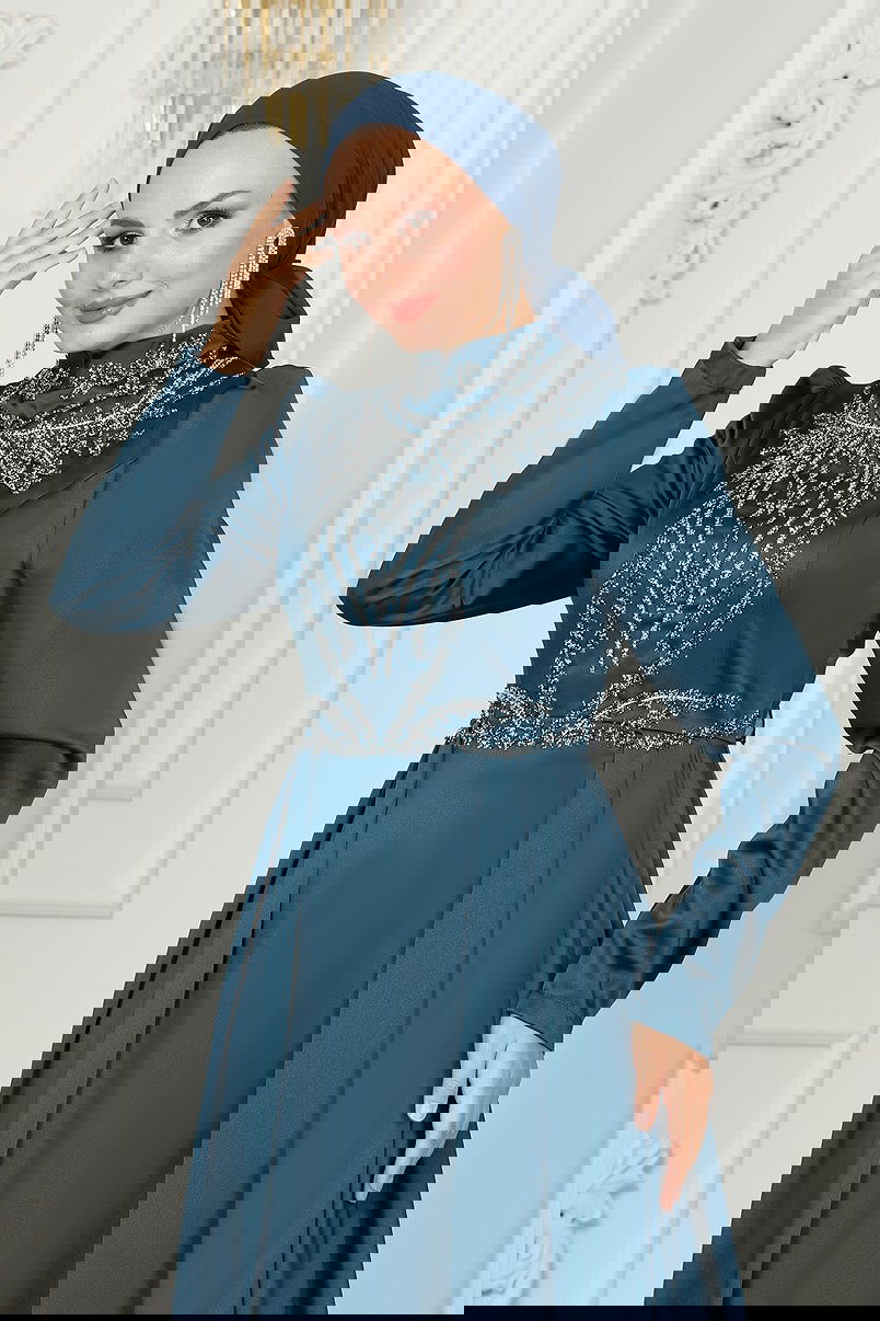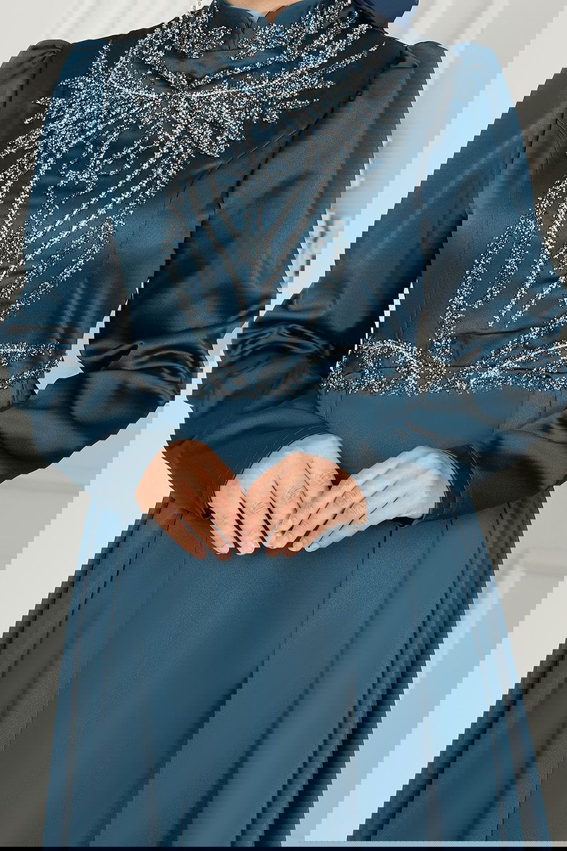 Stone Detailed Tailcoat Evening Dress. ABAYA model hijab product. It can be used in Four Seasons. Only dry cleaning should be done. It is made of satin fabric. The product is Half Hakim neck. It is liningless. The product has back zippered. (The product on the model is size 38.) Height: 160 cm, Chest: 86 cm, Waist: 68 cm, Hip: 95 cm, Weight: 55 kg. The stones are glued.