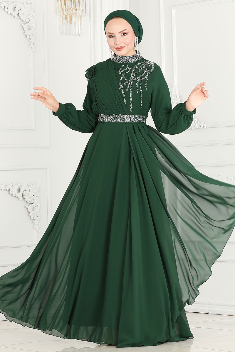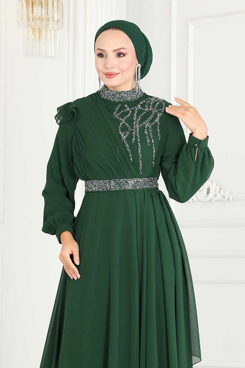Stone Embroidered Chiffon Evening dress is a hijab model. It can be used in all seasons. It should only be dry cleaned. It is made of first class Chiffon fabric. The product has a Half Hakim collar. It is lined. The product has a back zip. (The product on the model is size 38.) Height: 160 cm, Bust: 86 cm, Waist: 68 cm, Hip: 95 cm, Weight: 52 kg. The two ends of the belt are sewn to prevent it from waving, and the middle part is left empty (seamless). The stones are glued on. The belt is included with the product and can be optionally used.