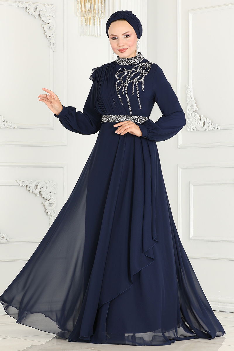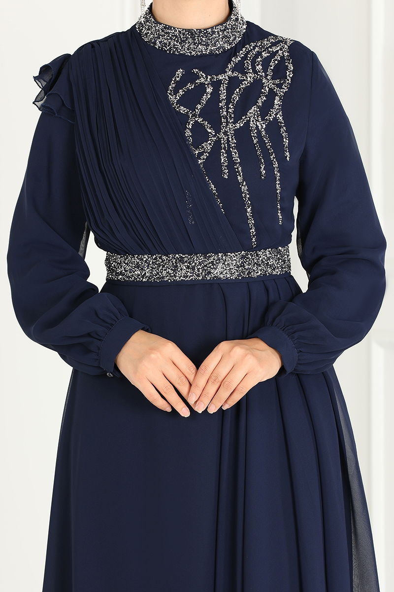 Stone Embroidered Chiffon Evening dress is a hijab model. It can be used in all seasons. It should only be dry cleaned. It is made of first class Chiffon fabric. The product has a Half Hakim collar. It is lined. The product has a back zip. (The product on the model is size 38.) Height: 160 cm, Bust: 86 cm, Waist: 68 cm, Hip: 95 cm, Weight: 52 kg. The two ends of the belt are sewn to prevent it from waving, and the middle part is left empty (seamless). The stones are glued on. The belt is included with the product and can be optionally used.