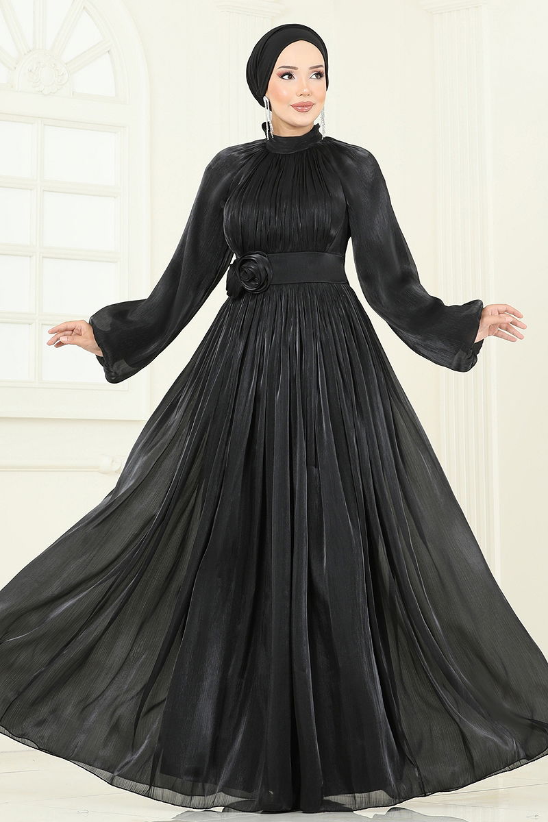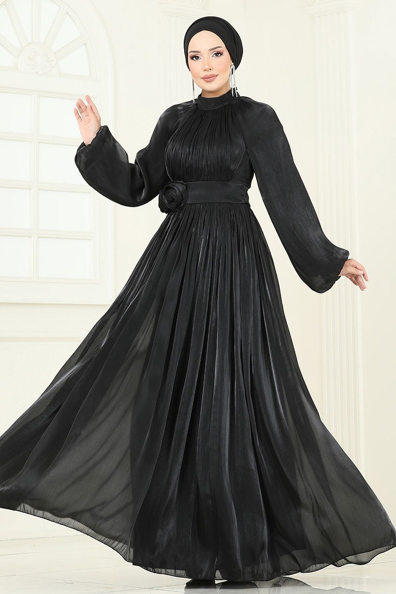 Designed to enhance your elegance, the Rose Accessorized Pleated Abaya can be comfortably worn across all seasons. This modest dress, which only requires dry cleaning, is made from crystal and janjan fabrics. It features a half mandarin collar, is lined, and has a zipper at the back for practicality and comfort. The flower accessory on it can be detached as per your preference. The wrist cuffs are elasticated, ensuring a comfortable fit. (The product model wears size 38.)