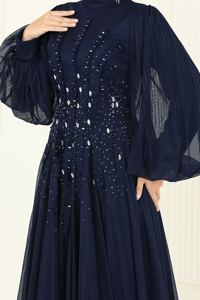 Crafted from top-quality chiffon, the Stone Detailed Chiffon Evening Dress for Hijab is an elegant choice for all seasons. This lined model features a back zipper closure and is equipped with breast pads. It showcases special stitched details at the waist and rhinestone embellishments, along with balloon sleeves, offering a contemporary look. Dry cleaning is recommended for maintenance.