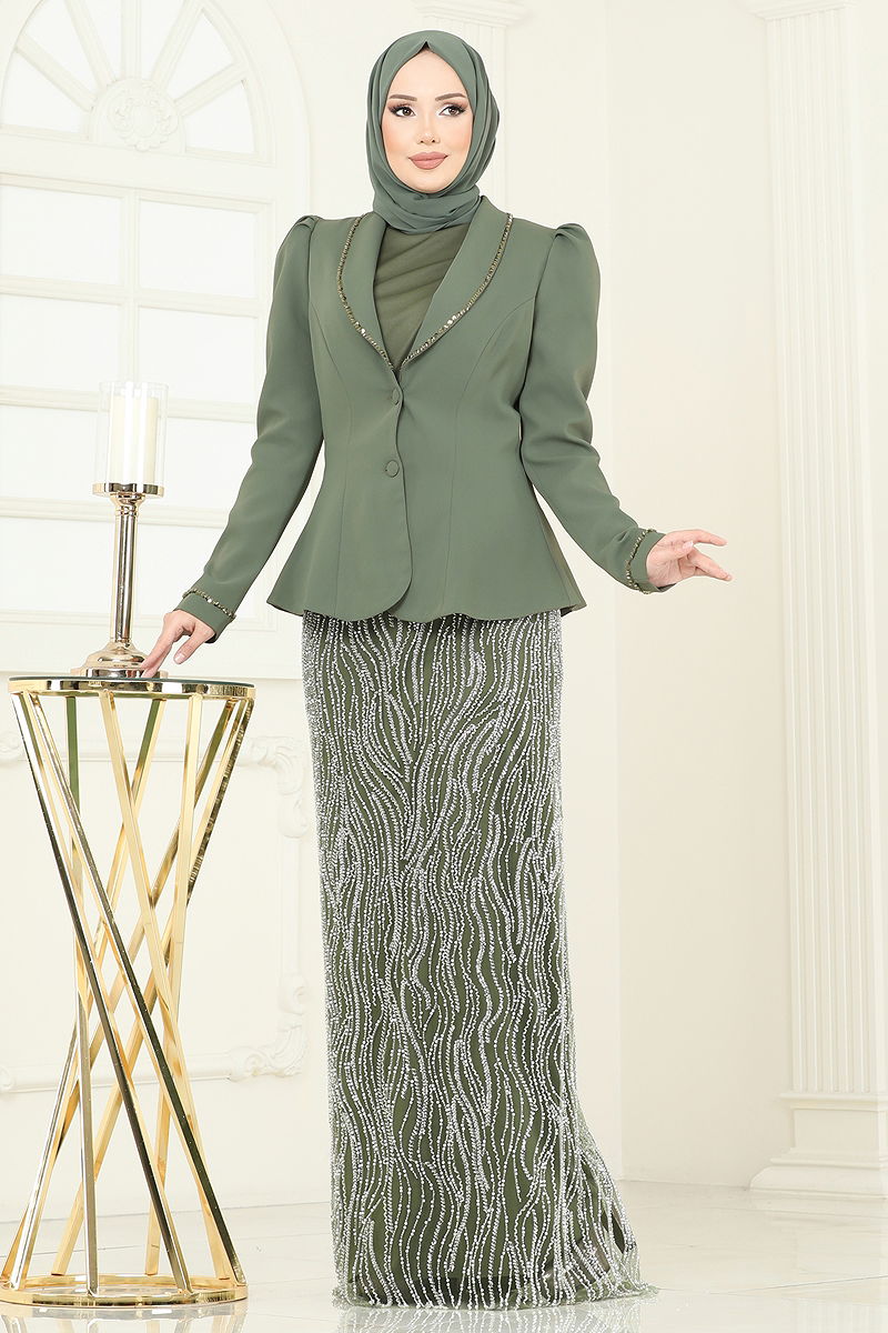 Product Feature : It is a new season hijab fashion product. The product has a Double-breasted collar. The product has half front buttons. The jacket is lined.. The sequin detail is sewn. Blouse is not included. Sample combination is made with the blouse to show the intended use of the product. The skirt has a zipper at the waist. There may be a tonal difference in the product due to concept photo shoots.