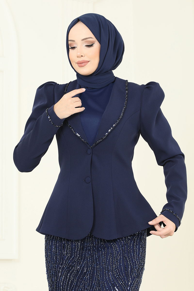 Product Feature : It is a new season hijab fashion product. The product has a Double-breasted collar. The product has half front buttons. The jacket is lined.. The sequin detail is sewn. Blouse is not included. Sample combination is made with the blouse to show the intended use of the product. The skirt has a zipper at the waist. There may be a tonal difference in the product due to concept photo shoots.