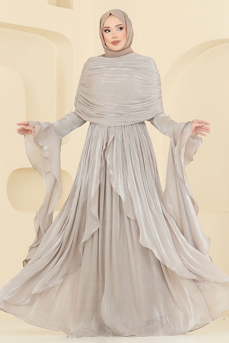 Product Name: SUAL Draped Detail Ruffled Gown. This elegant and modern modest gown can be comfortably worn in all seasons. Made from exquisite organza fabric, this dress features a crew neck and ruffled skirt details that catch the eye. Its lined structure and zippered back design offer both comfort and style. Note: The product shown on the model is size 38. Should be cleaned by dry cleaning only.