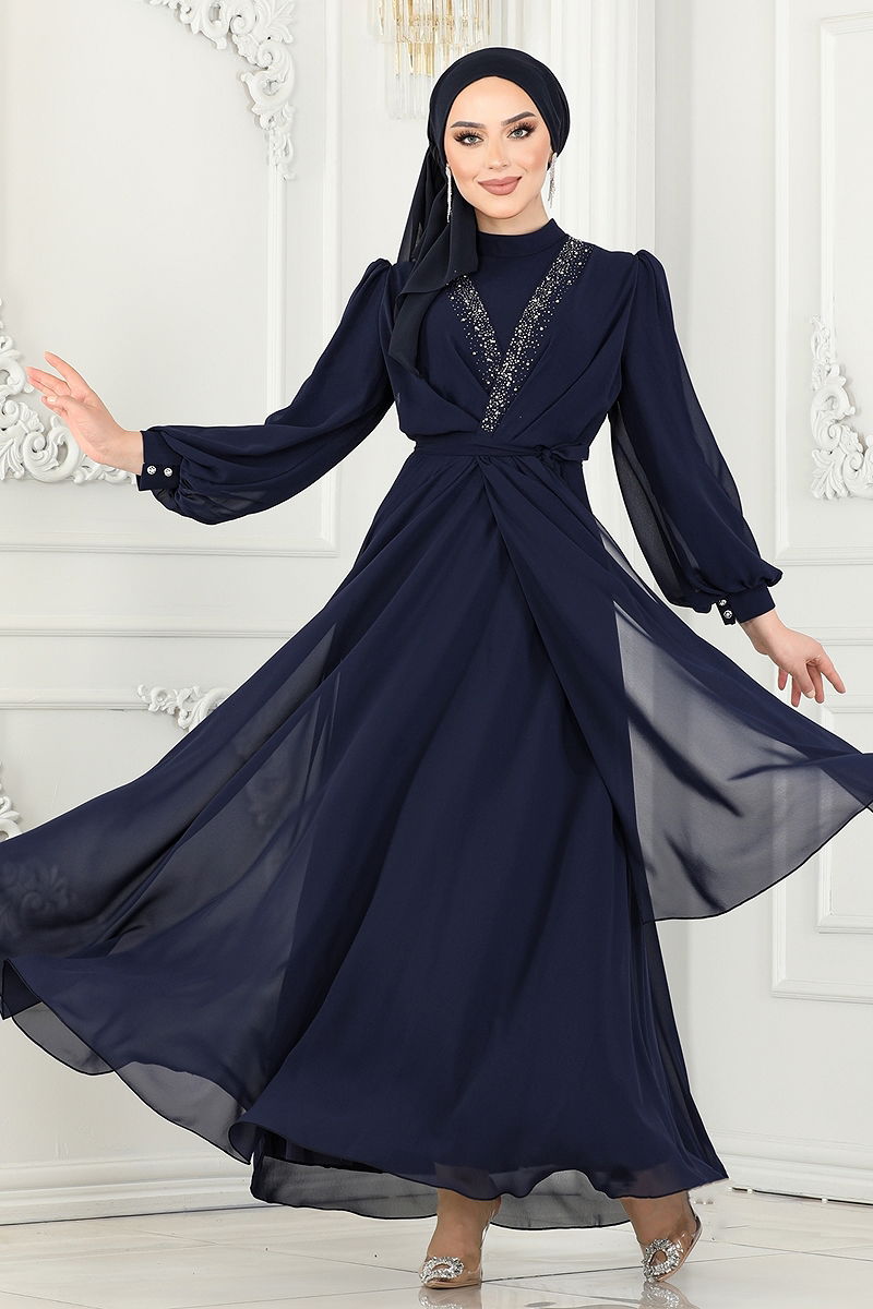 Stone-embellished Chiffon Evening Gown. This model is a hijab evening dress suitable for all seasons. Dry cleaning only. It is made of first-class chiffon fabric. The product has a half-sheath collar. It's lined. Back zippered.(The product on the model is size 38.)Height: 160 cm, Bust: 86 cm, Waist: 68 cm, Hip: 95 cm, Weight: 52 kg. The pearl details are appliqued. The two ends of the belt are sewn to prevent fluttering, and the middle part is left empty (seamless). The belt is included in the product and is optional to use. Stones are adhesive.