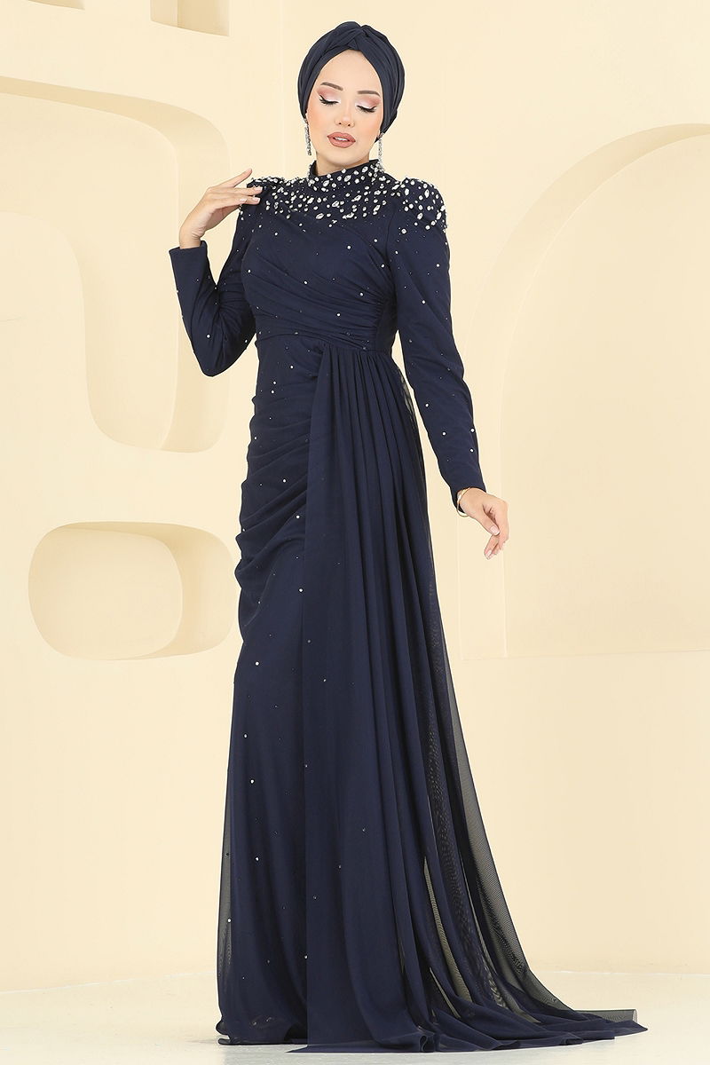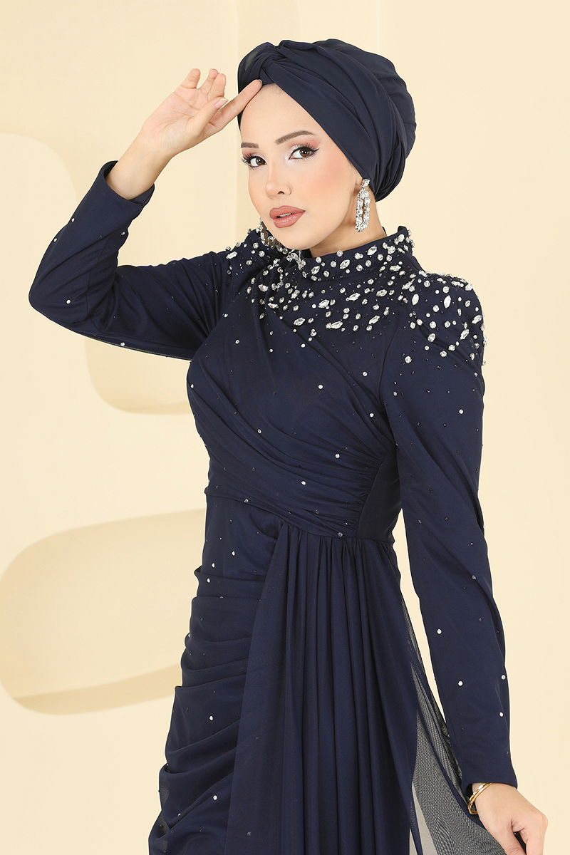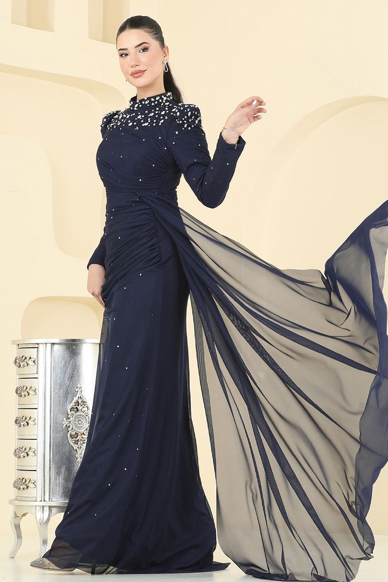 Elevate your elegance with the Drape Details Beaded Elegant Evening Dress, usable across all four seasons. Its chiffon fabric offers lightness and comfort. The half mandarin collar and lined design ensure a comfortable wear, while its back zipper makes it easy to put on. It features eye-catching stone and bead details. Only dry cleaning is recommended. The product displayed is in size 38.