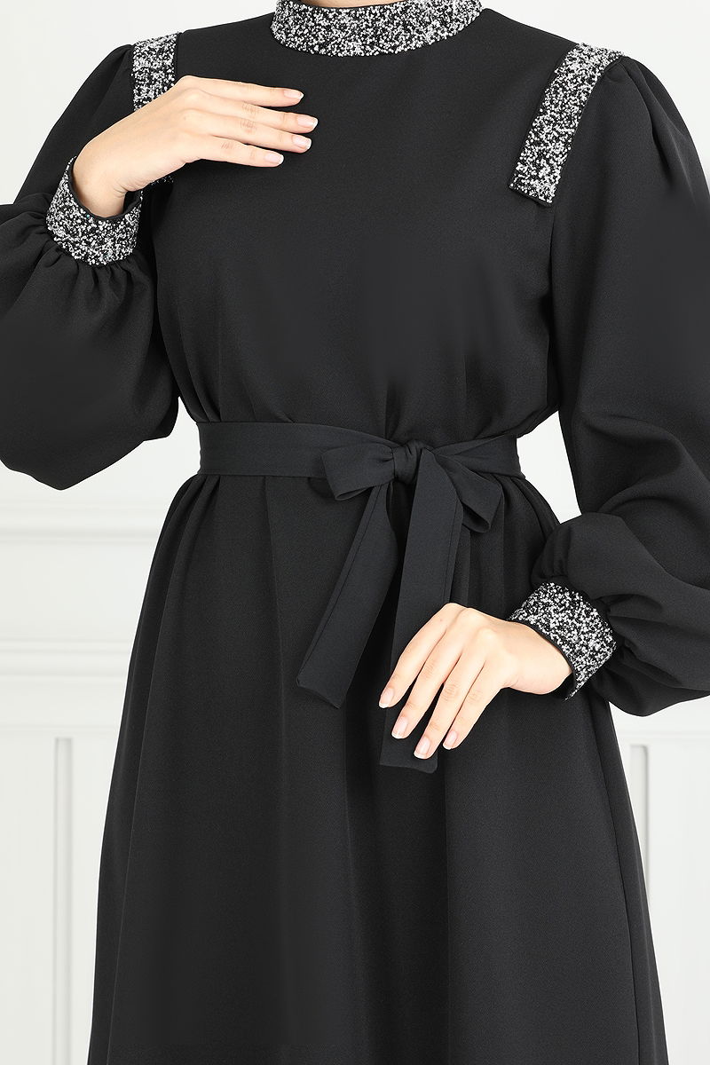 The Stone Detailed Stylish Evening Dress is designed as a modest wear piece and can be comfortably used in all seasons. Designed for your special occasions to capture elegance, this dress should only be dry cleaned. It offers comfort with its mandarin collar and lining-free design. The size 38 on the model is given as a sample. There is a button at the back of the dress for easy use. The stone details are adhesive, and the belt ends have been sewn to prevent waviness. The belt is included with the dress and can be optionally removed.