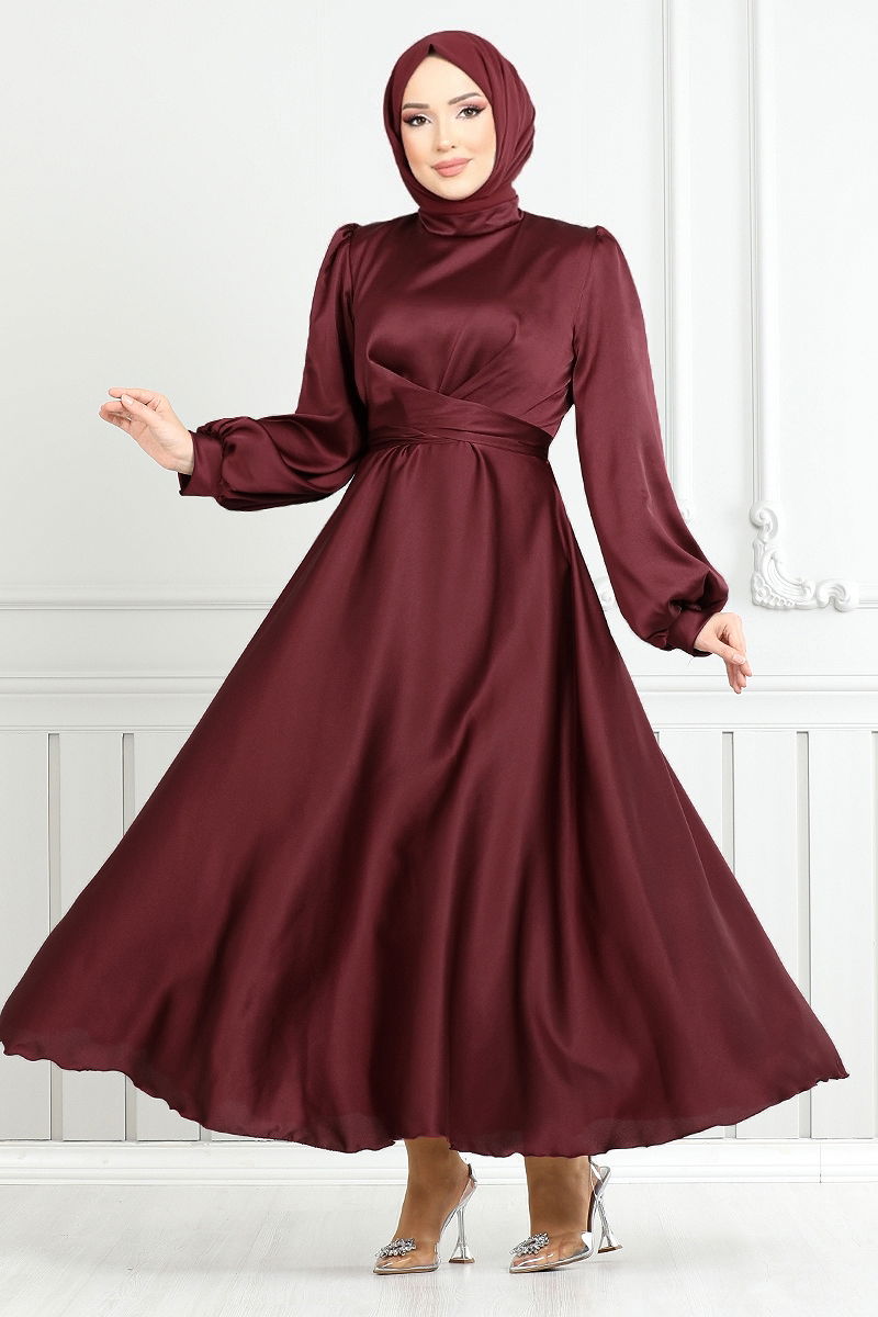 Product Name: Belted Satin Evening Dress This elegantly designed Belted Satin Evening Dress is a modest wear model suitable for all seasons. Made from high-quality satin material, this dress features a sophisticated stand collar and is unlined. It has a zipper in the back, and the belt detail is sewn on the dress. (The product on the model is size 38.) The product should only be dry cleaned.