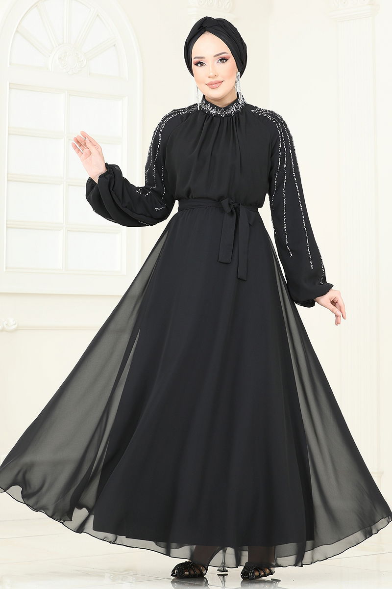 Elegant and stylish, the Bejeweled Sleeve Chiffon Gown is a modest attire suitable for all seasons. This chic dress is made from chiffon and maintained exclusively through dry cleaning, ensuring durability and a classy look. It features a high collar neck and a zipper closure at the back for ease. Adorned with glued jewels on the sleeves, it brings a dazzling shine. The gown includes an integrated belt that can be styled with or without, depending on your preference, and the elastic cuffs offer a comfortable fit. Craft the look you desire with or without the belt.