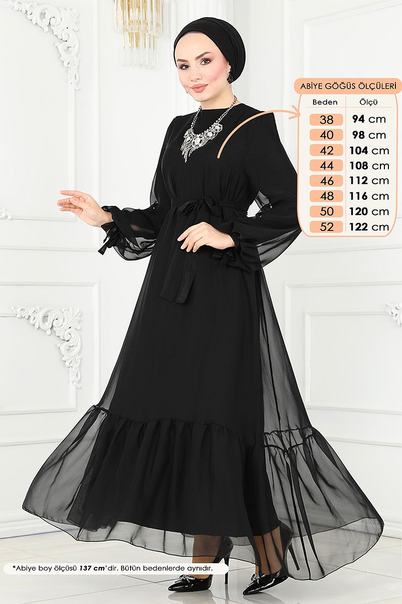 The Laced Cuff Evening Dress, a chic and elegant piece from the modest fashion world. Suitable for all-season wear, this lined dress is made from shimmer fabric and features a Mandarin collar. It is designed as a single color with a back zipper and should only be dry cleaned. It comes in a size 38 model measuring 167 cm height, 90 cm bust, 70 cm waist, and 100 cm hips. As a stylish detail, the belt is stitched at both ends with an unstitched middle; the belt comes with the dress and can optionally be removed. The laced cuffs make this dress a perfect choice for your special occasions.