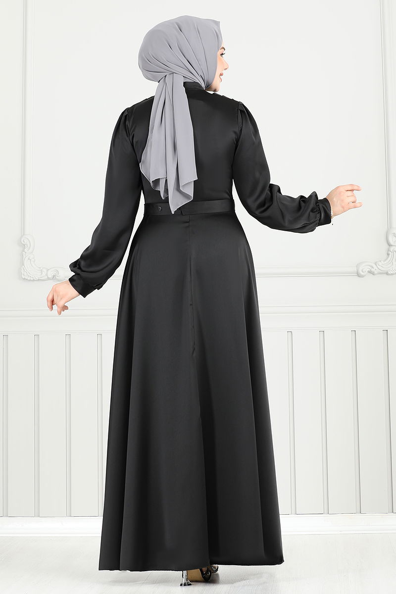 The Draped Satin Gown is an elegantly designed modest wear suitable for all seasons. This gown must be dry cleaned only and is made from high-quality satin fabric. It features a semi-high collar and a zip at the back, offering a blend of elegance and comfort with its unlined structure. The included belt, which can be optionally removed, adds a touch of refinement, with sewn ends and an unstitched middle part for a ripple-free fit. Finished with draped details and precise stitching, this gown is perfect for making a statement on special occasions.