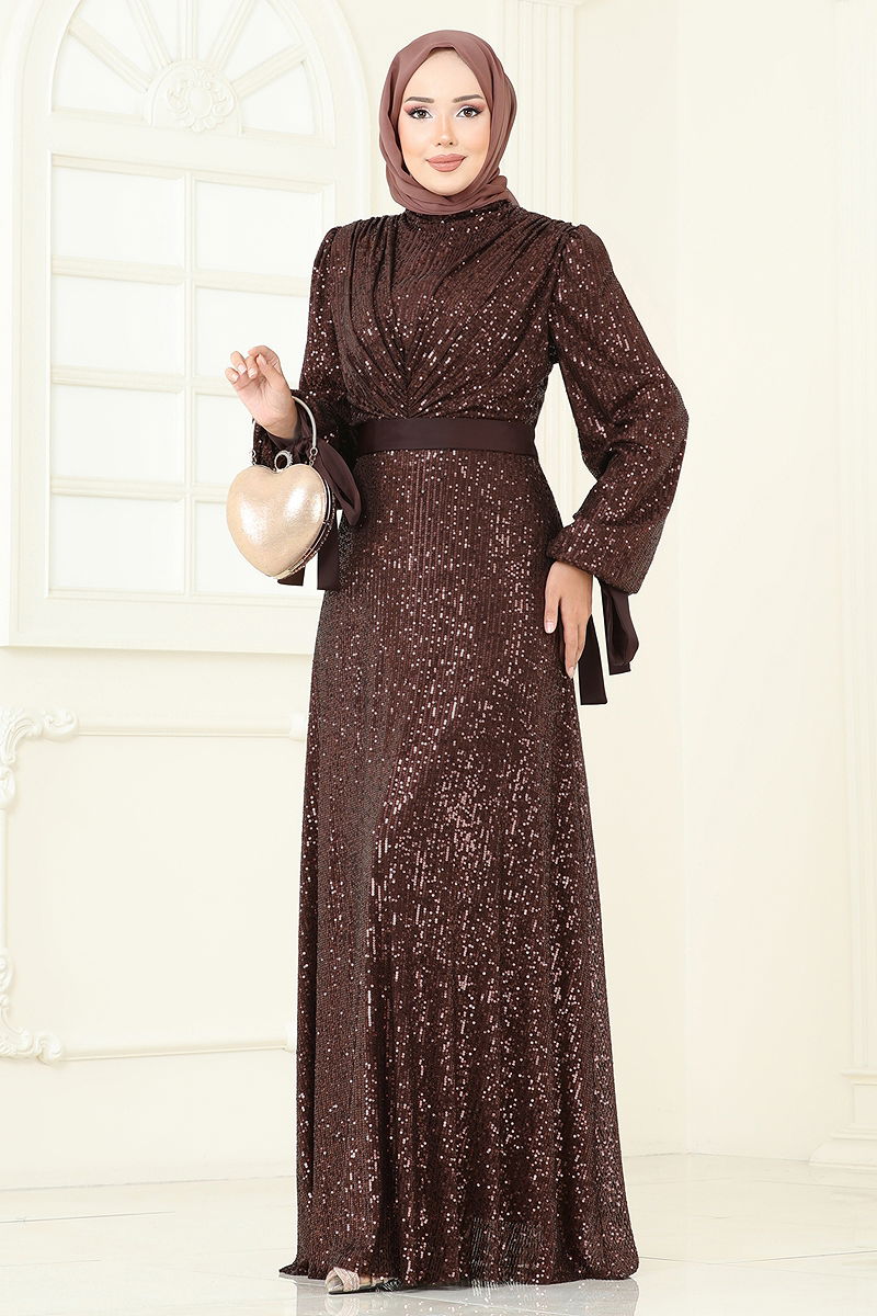 The Draped Chest Modest Evening Dress combines elegance and sophistication, making it a perfect choice for any season. This eye-catching dress is embellished with sequin details, ensuring you are the center of attention at special events. It features a lining and a stand-up collar for comfort, and is designed with a zipper at the back for easy wear. The cuffed sleeves and a stitched waistline with a belt detail complete this dress. The belt enhances the elegance and can be optionally removed. This special design, which should be dry cleaned only, will become an indispensable part of your wardrobe.