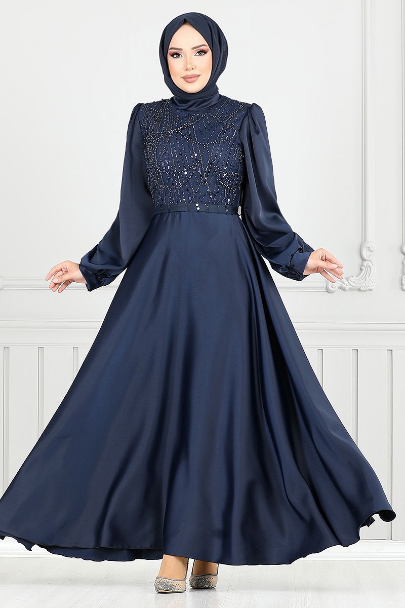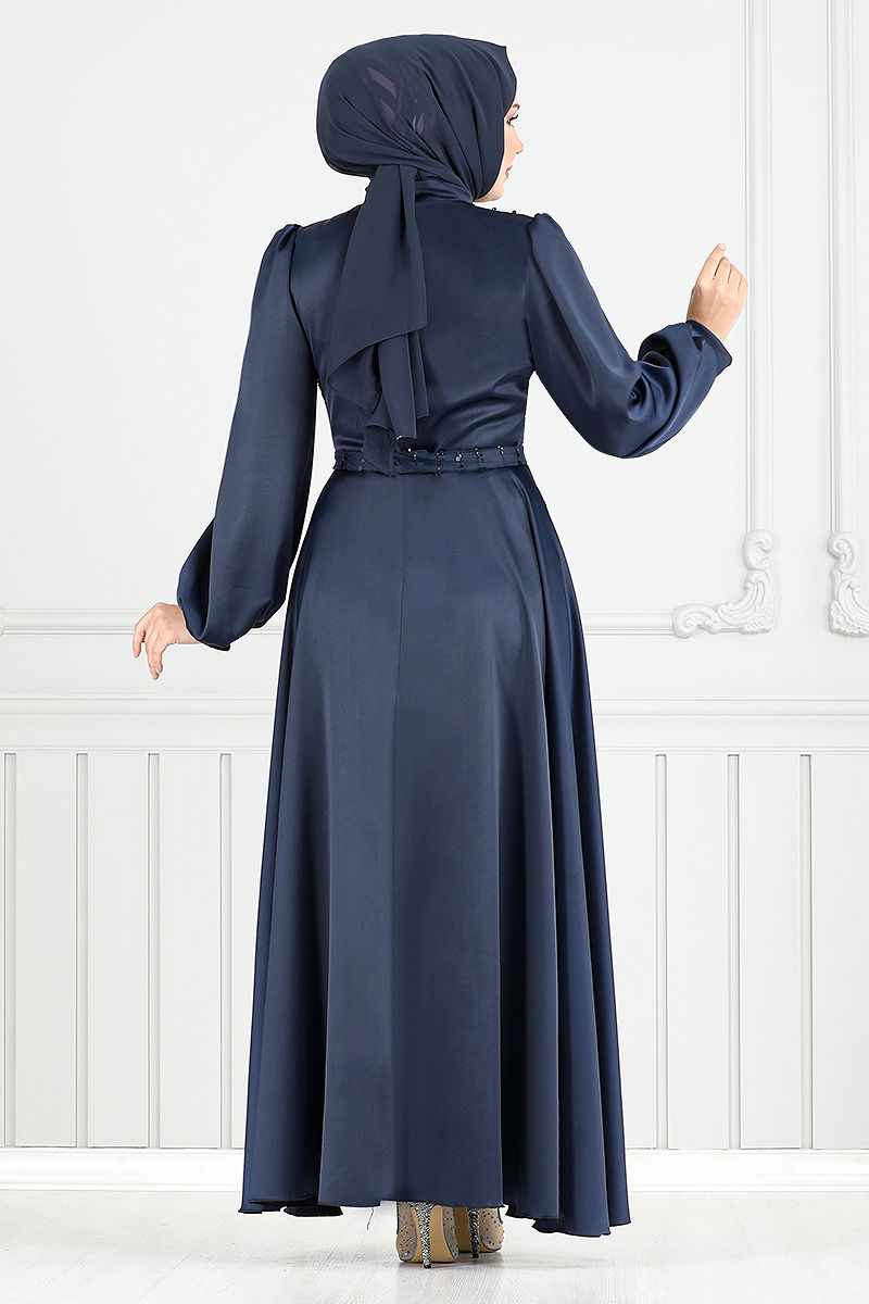 Elegant and stylish, the Sequined Detail Satin Evening Dress is a perfect addition to your modest wear collection. Suitable for all seasons, this evening dress guarantees to dazzle at your special occasions with its commanding collar design and rear zipper feature. Made from satin, it offers supreme comfort, while the sequined details add a touch of glamour. Dry cleaning is recommended, and the belt detail can be adjusted or removed as per your style preference.