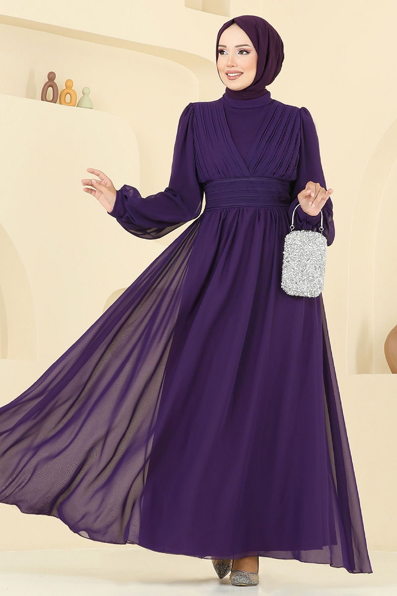 This Draped Front Chiffon Evening Dress is a modest wear that encapsulates elegance and comfort for all seasons. Only suitable for dry cleaning, this garment is made from durable chiffon fabric. It features a semi-Mandarin collar and a zippered back, offering a contemporary look. The lined design and stitched waistline create a sculpted, stylish silhouette, while the sewn-in belt enhances its elegance. Presented in size 38 for the model, this dress is perfect for making a dazzling impression on any special occasion.