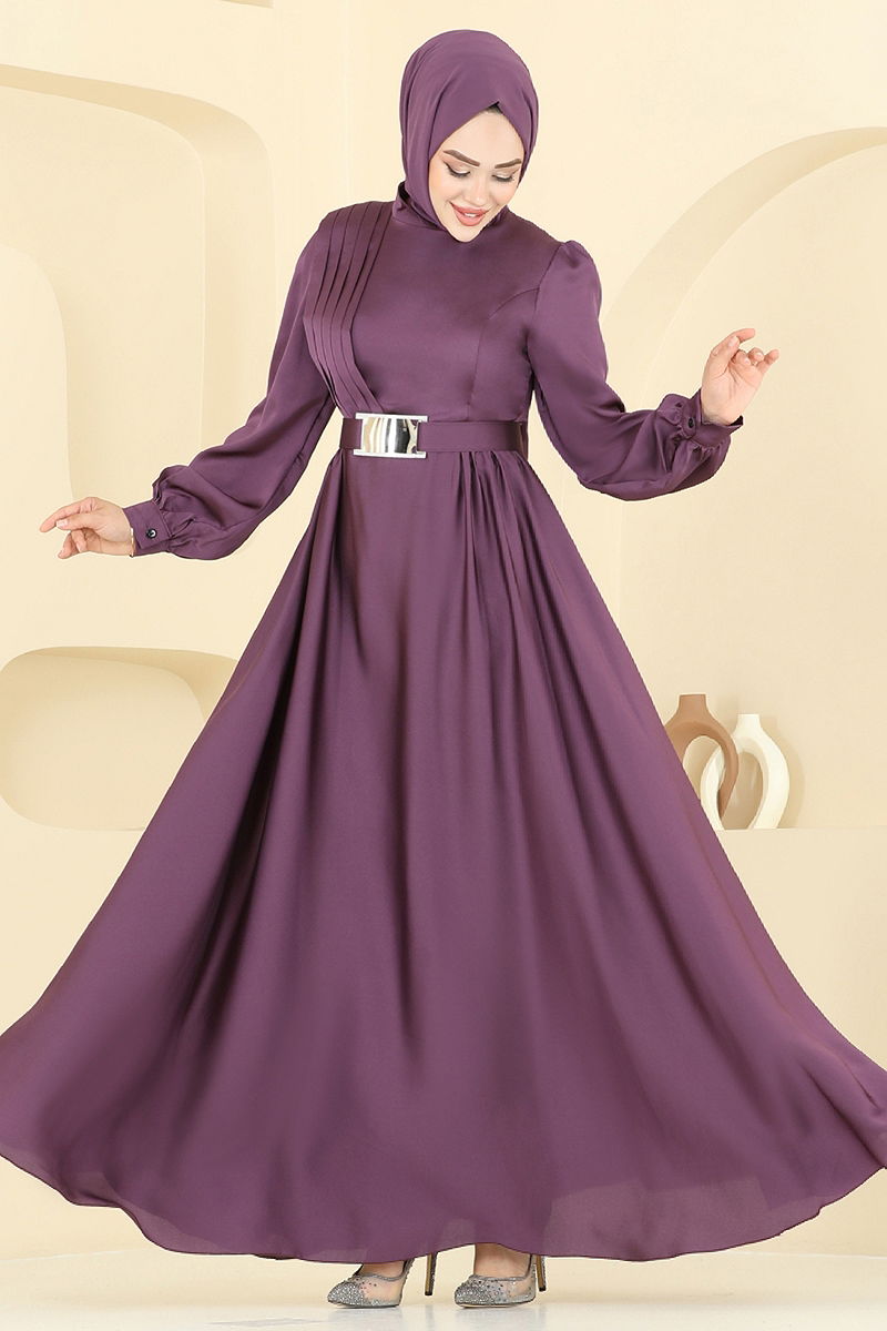 The Belted Satin Evening Gown is an elegant choice and a special modest wear product that can be worn in all seasons. It features luxury touches of Kobe and satin fabric, a semi-Mao collar, and a zippered back design that stands out. The belted design offers a modern silhouette. The product is unlined and should only be dry cleaned. Ideal for those seeking versatile elegance.