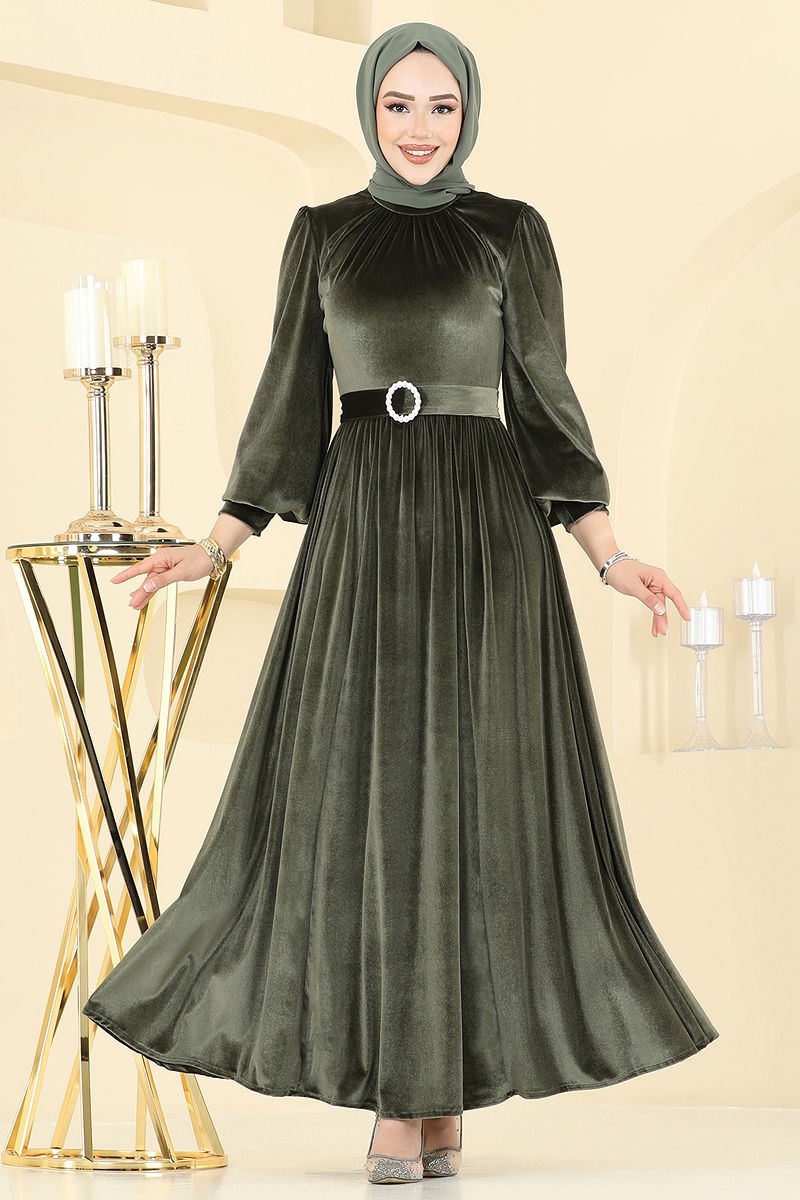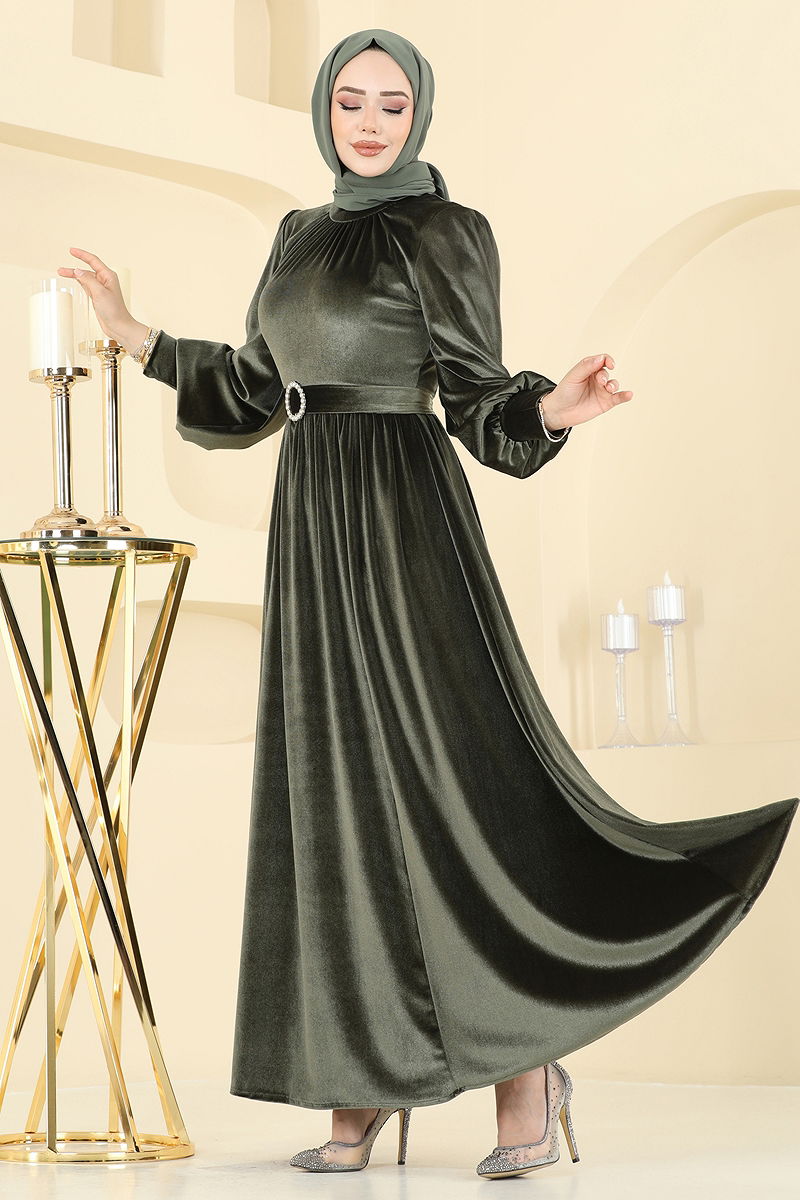 Elevate your elegance with the Stone Belted Evening Dress, offering both style and comfort together. Suitable for wearing in all seasons, this modest evening dress is made from velvet fabric and requires hand washing. Its semi-high collar and zipper back design provide practical use. The dress features an unlined structure and stitched waist details for a comprehensive chicness. A stylish belt completes the design, sewn at both ends to prevent waving, with the middle left stitch-free for flexibility. The belt comes with the dress and can be optionally removed.