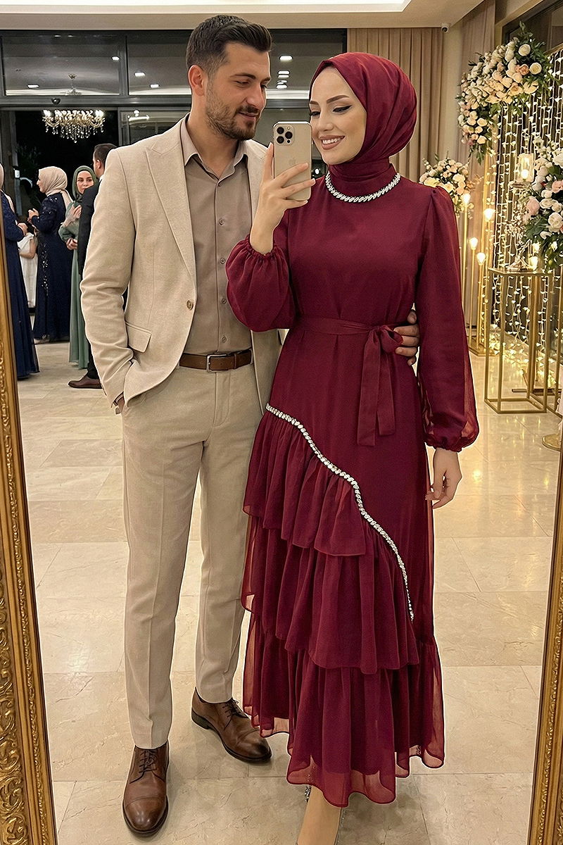 The Layered Skirt Jeweled Evening Dress is designed for modesty, making it perfect for special occasions and can be worn in all seasons. Made from fine Adriana (Imported Crepe) and chiffon fabrics, it offers comfort and lightness. Features a semi-high collar and back zipper for a contemporary look. The dress is unlined and adorned with jewel details. The belt is tailored to prevent waviness and is detachable, allowing flexibility in style. This garment should only be dry cleaned.