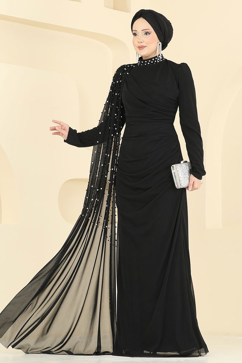 This elegant Stone-Detailed Tulle Evening Dress is a modest garment suitable for use across all seasons. It should be dry cleaned only and is crafted from tulle bead fabric. Featuring a half-mandarin collar and lined for added comfort with a stretchable lining to ensure freedom of movement. The dress is zippered at the back, has a seamed waist, and is adorned with embedded stone details. The attached cape completes the exquisite look. The product size shown on the model is a size 38.