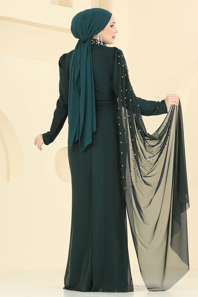 This elegant Stone-Detailed Tulle Evening Dress is a modest garment suitable for use across all seasons. It should be dry cleaned only and is crafted from tulle bead fabric. Featuring a half-mandarin collar and lined for added comfort with a stretchable lining to ensure freedom of movement. The dress is zippered at the back, has a seamed waist, and is adorned with embedded stone details. The attached cape completes the exquisite look. The product size shown on the model is a size 38.
