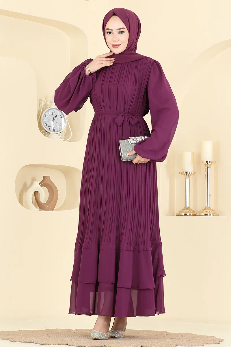 Elegant and chic, the Pleated Belted Chiffon Gown is an all-season stunner! This modest dress, with a lining and bicycle collar, offers a light and comfortable wear with its chiffon fabric. The back zipper design and adjustable front belt ensure both style and comfort. Easily maintained with dry cleaning, this gown is completed with a belt detail. Wear it with or without the belt, perfect for making a dazzling impression on special occasions.