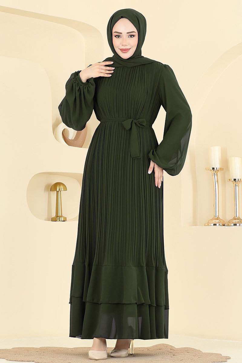 Elegant and chic, the Pleated Belted Chiffon Gown is an all-season stunner! This modest dress, with a lining and bicycle collar, offers a light and comfortable wear with its chiffon fabric. The back zipper design and adjustable front belt ensure both style and comfort. Easily maintained with dry cleaning, this gown is completed with a belt detail. Wear it with or without the belt, perfect for making a dazzling impression on special occasions.
