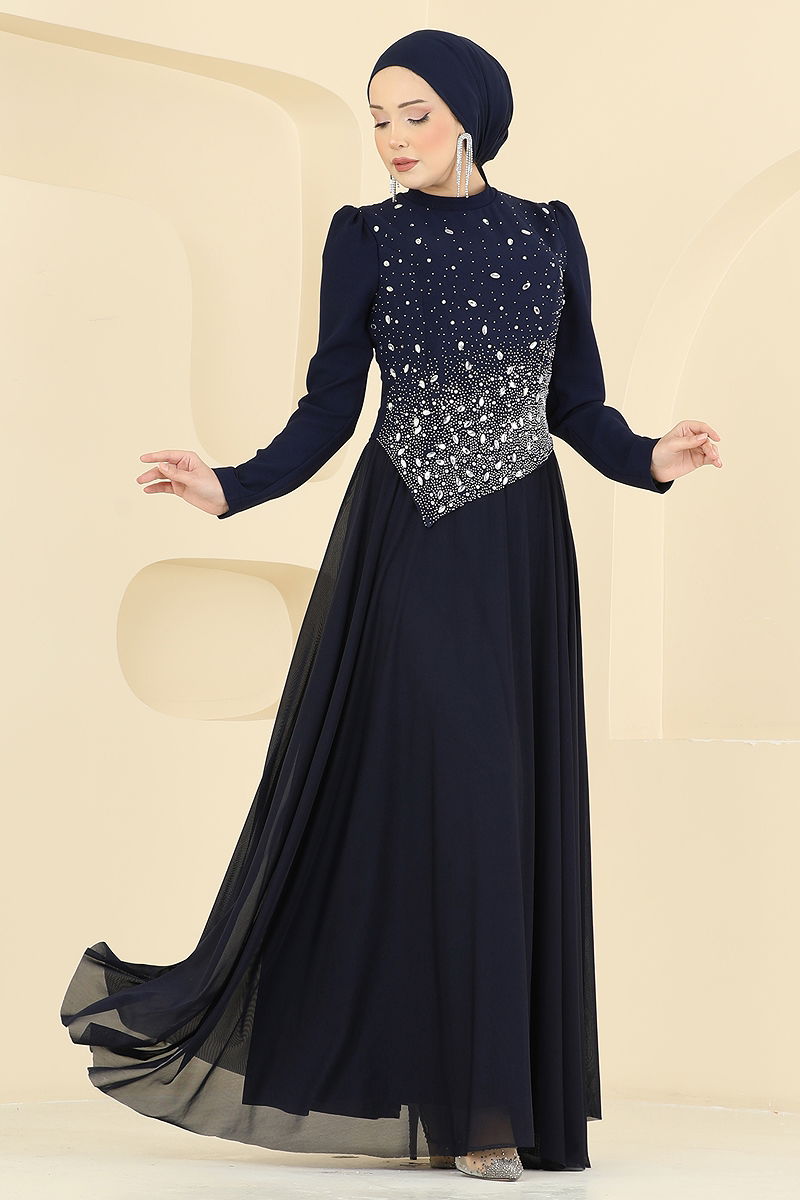 The Front Stone Crepe Evening Dress is an elegant choice for modest clothing. Suitable for all seasons, this dress combines the elegance of crepe and tulle fabrics. It offers a comfortable fit with its upright collar and lined design. The zipper at the back makes it easy to wear and remove. The stone details at the front add a modern look to the dress. Care is exclusively by dry cleaning. This product is displayed on a model with a size 38.