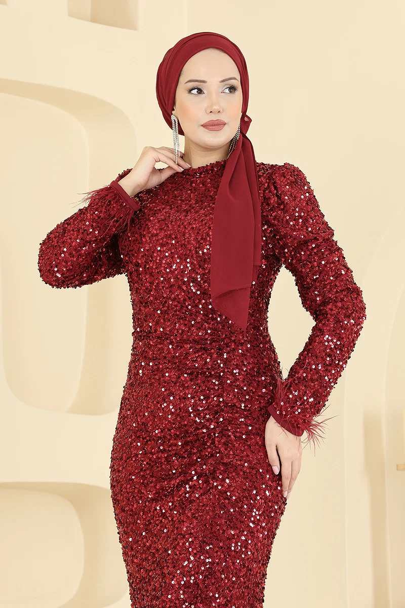 The Drape Detailed Sequin Evening Dress offers an impressive and elegant look with its modest design, suitable for all seasons. Made from sequin fabric, this special gown provides comfortable wear with its lined structure and zipper at the back. The straight collar design and meticulously attached ostrich feathers complete the sophisticated details on the dress. The product should only be dry cleaned. The item displayed is a size 38.