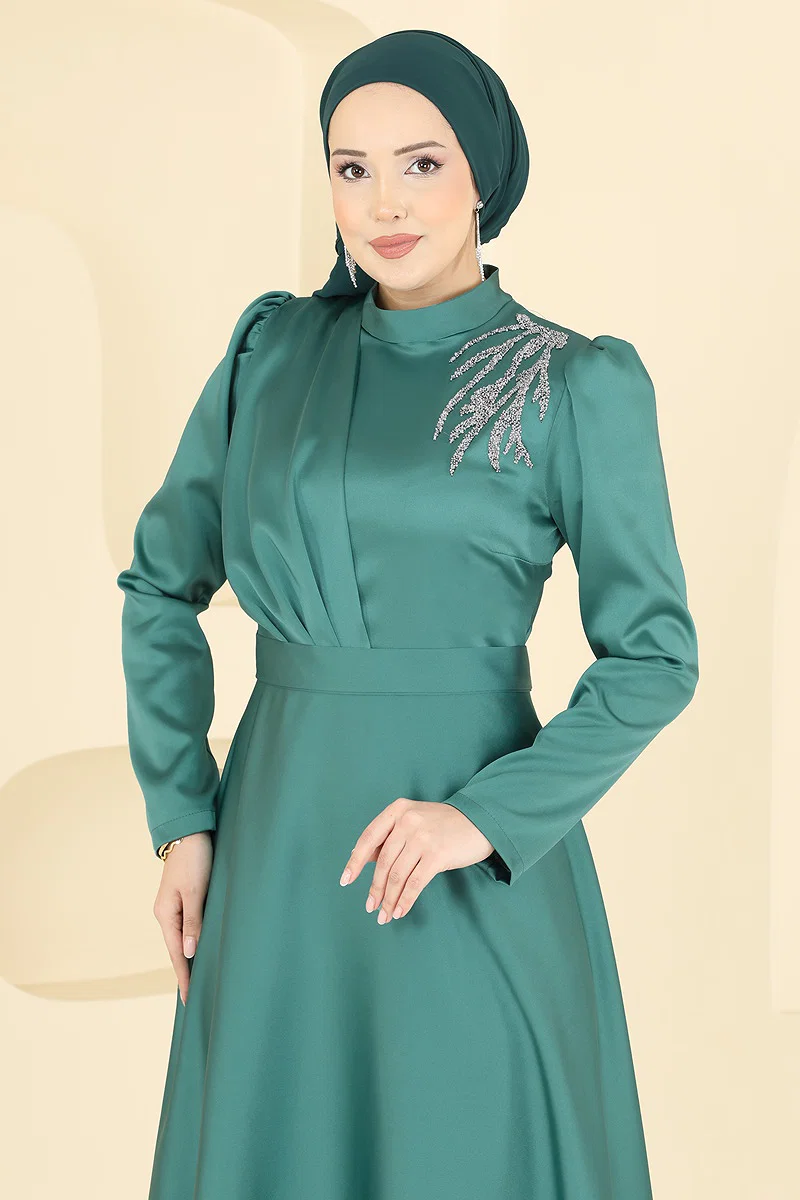 The Shoulder Stoned Satin Dress combines elegance and style in a single design, ideal for wearing in all seasons. This modest evening dress offers practicality with its 30-degree sensitive washing option. Made from satin, the dress features a stand-up collar and a lining-free structure, prioritizing comfort. The zipper at the back makes it easy to wear. Its striking stone details add a dazzling look. The belt is optional; you can use it if you like or remove it according to your preference.