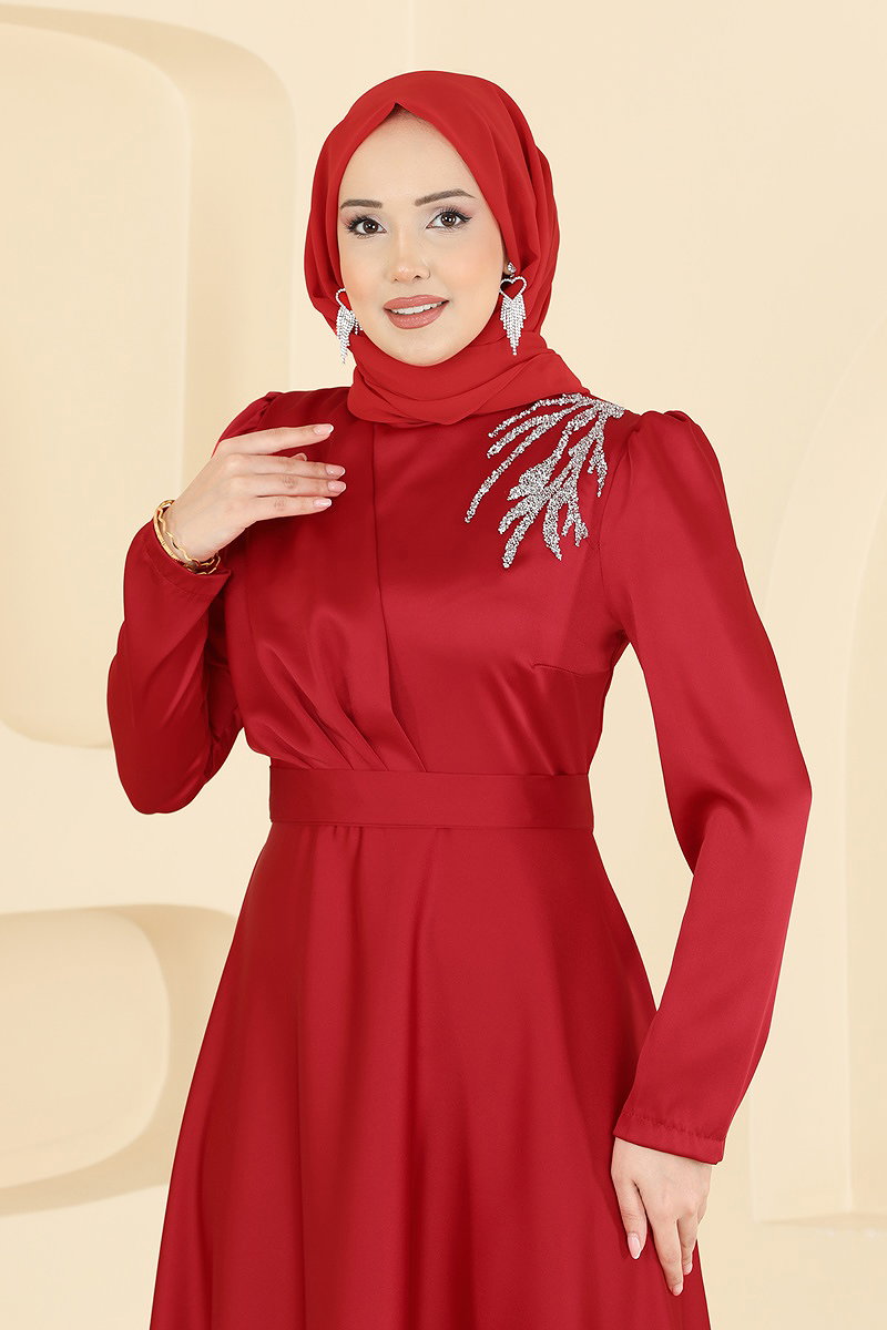 The Shoulder Stoned Satin Dress combines elegance and style in a single design, ideal for wearing in all seasons. This modest evening dress offers practicality with its 30-degree sensitive washing option. Made from satin, the dress features a stand-up collar and a lining-free structure, prioritizing comfort. The zipper at the back makes it easy to wear. Its striking stone details add a dazzling look. The belt is optional; you can use it if you like or remove it according to your preference.