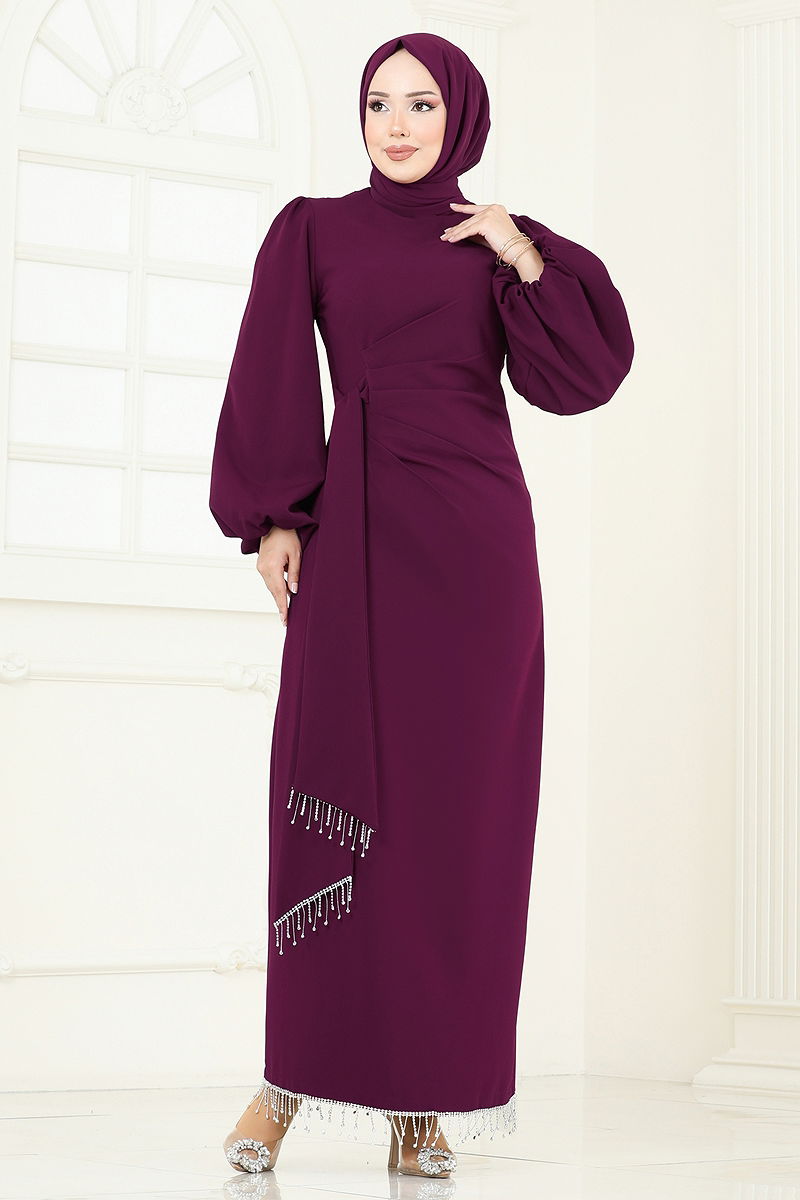 Product Feature : It is a new season hijab fashion product. It has a belt that can be fastened from the side. The product has a Cycling collar. Unlined. The product has a zipper at the from the back part. Stone details are erected. Belt is sewn to the product. Balloon sleeves. There may be a tonal difference in the product due to concept photo shoots.