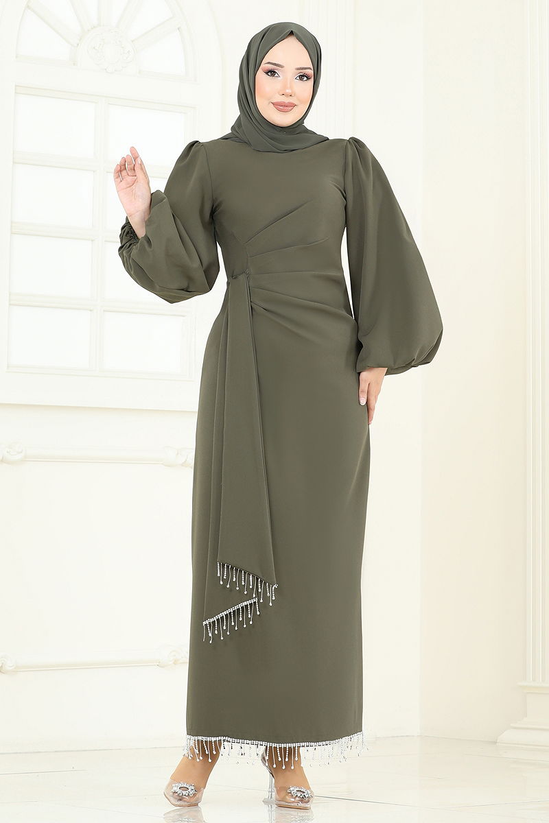 يحتوي على حزام يمكن تثبيته من الجانب. المنتج لديه ياقة دائرية. غير مبطنة. المنتج به سحاب في جزء من الخلف. التنورة تحتوي من الاسفل على شراشيب يتم خياطة الحزام على المنتج. أكمام البالون. قد يكون هناك اختلاف في الدرجة اللونية في المنتج بسبب التقاط الصور الفوتوغرافية.