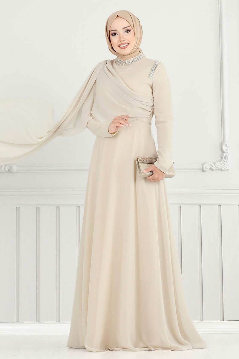 SUAL's Stone Detail Cape Evening Dress combines elegance and grace for your special occasions. Suitable for four seasons, this modest evening dress is made of chiffon fabric and features a semi-mandarin collar that catches the eye. The dress has a zipper at the back for practicality and is lined. Decorated with stone details, this dress should only be dry cleaned. The displayed model wears a size 38 and the waist is stitched.