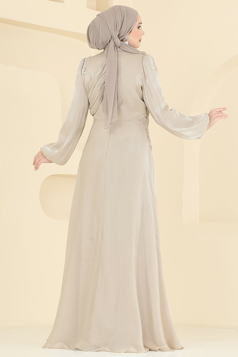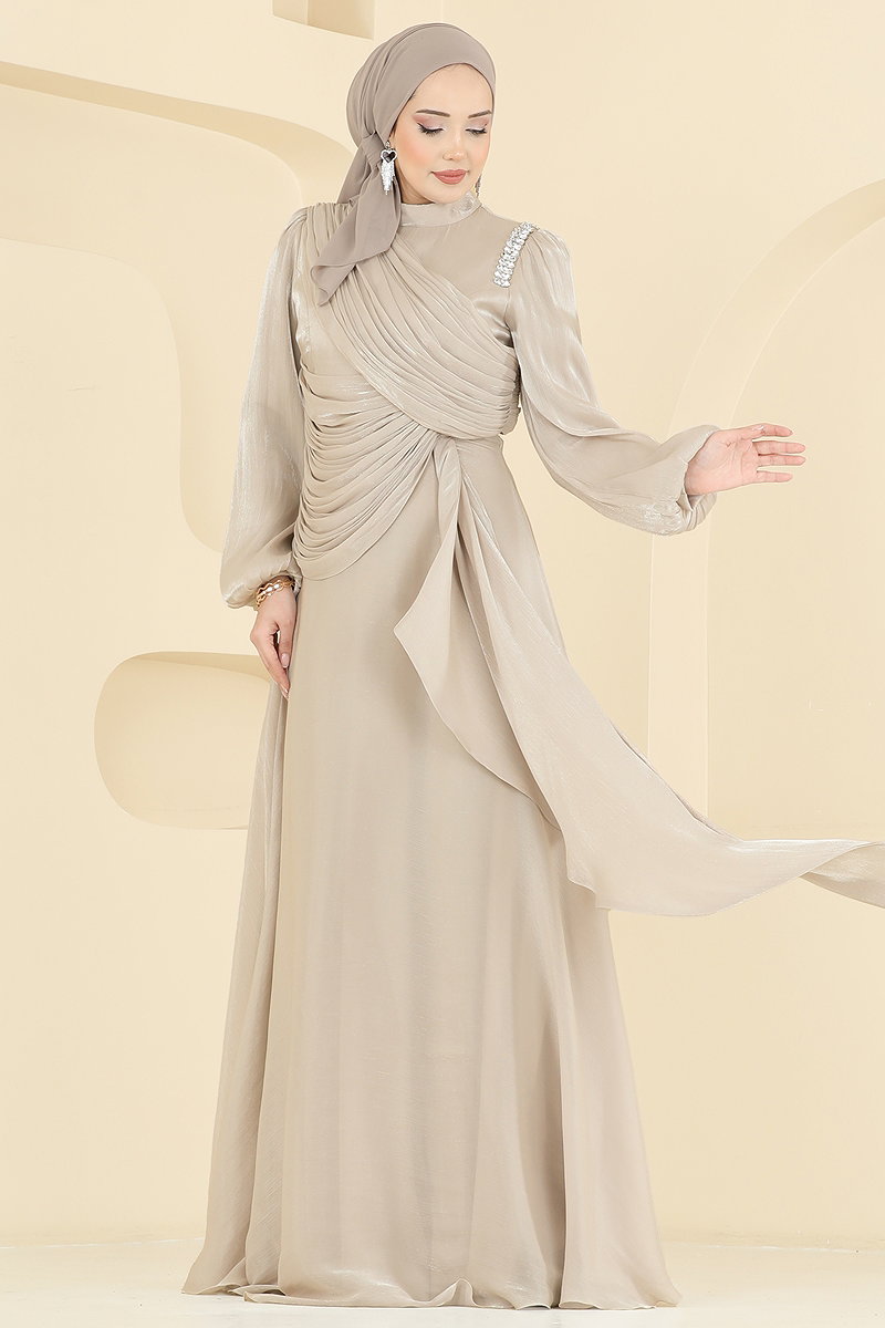 This elegant Draped Detail Organza Evening Dress offers a sophisticated look. Suitable for hijab wear, this model can be comfortably used in all four seasons. It can be easily cleaned with a gentle wash at 30 degrees. Made from organza fabric, it is lined and features a stand-up collar design that captures attention. There is a practical zipper in the back. The stone details add a striking brightness. The product is modeled in size 38.
