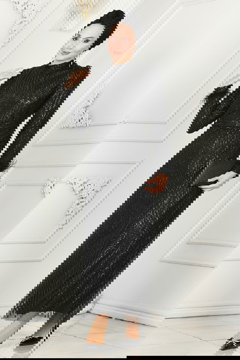 Kolları Otriş Detail Evening Dress is a TURKISH dress model for Islamic dress fashion. It can be used in Four Seasons season. Only dry cleaning should be done. It is made of first class Glitter Tulle fabric. The product is Half Judge collar. It is lined. The product has a zipper from the back. (The product on the model is size 38.) Height: 160 cm, Chest: 86 cm, Waist: 68 cm, Hip: 95 cm, Weight: 52 kg. Otriş feathers are sewn onto the product. The belt is sewn.
