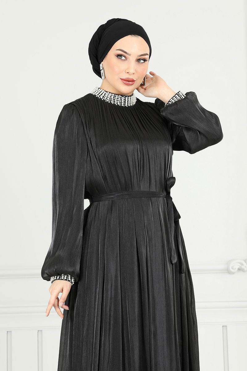 The Pearl Collar Modest Evening Dress combines elegance and style flawlessly under the model. Suitable for all seasons and requiring only dry cleaning, this dress is made from shiny fabric and features a mandarin collar and lined design. The back zipper ensures ease of use, while the pearl details add a spectacular touch. The belt, designed to prevent waviness, is included with the dress, but can be optionally removed. An ideal choice for fitting your body measurements.