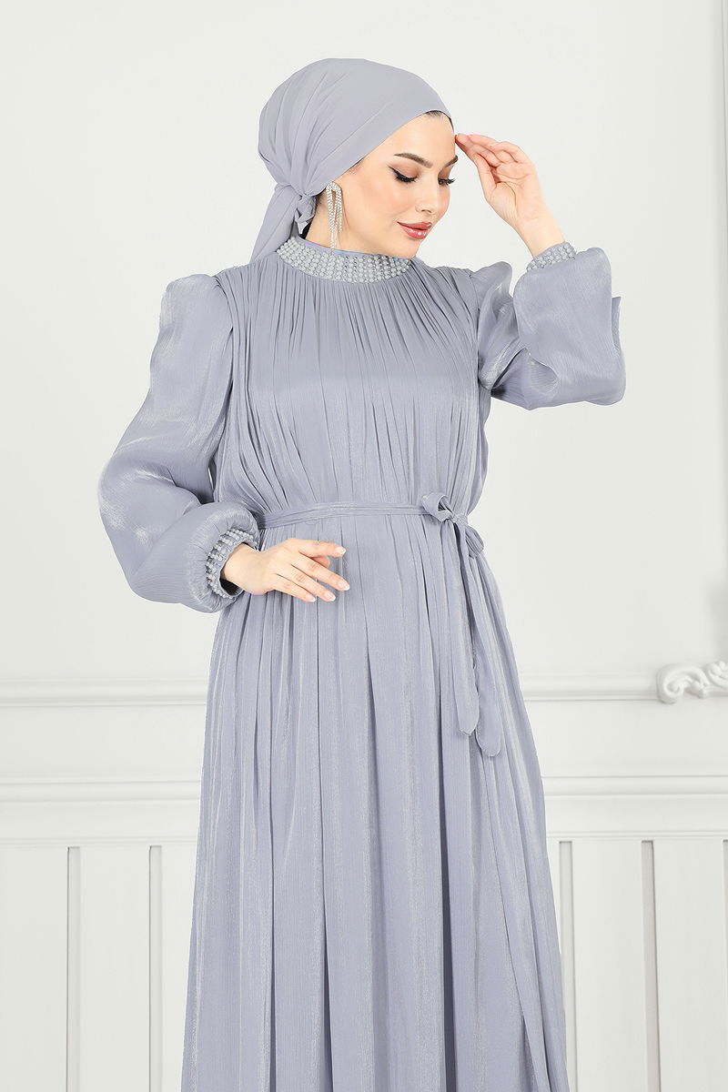 The Pearl Collar Modest Evening Dress combines elegance and style flawlessly under the model. Suitable for all seasons and requiring only dry cleaning, this dress is made from shiny fabric and features a mandarin collar and lined design. The back zipper ensures ease of use, while the pearl details add a spectacular touch. The belt, designed to prevent waviness, is included with the dress, but can be optionally removed. An ideal choice for fitting your body measurements.