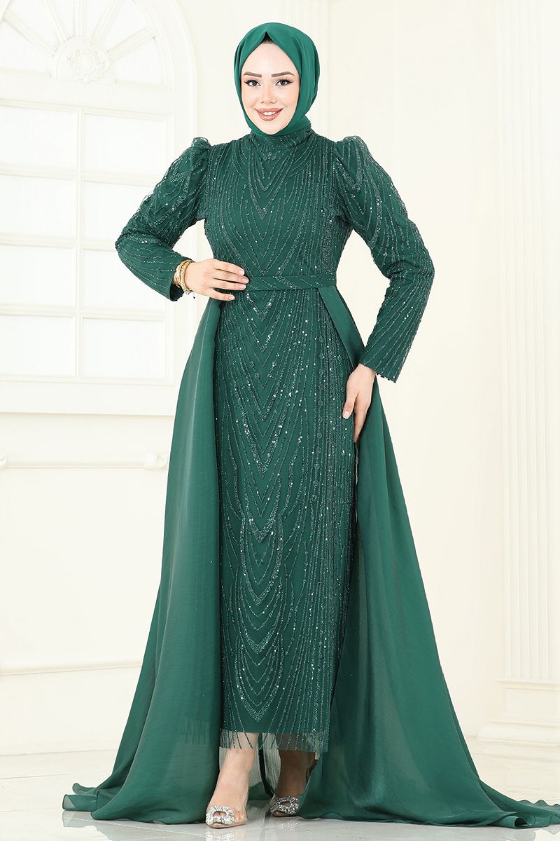 Elevate your elegance with the Cape-Detailed Glittery Evening Dress, suitable for wear in all four seasons. This modest dress is made from glittery tulle fabric and features a semi-mandarin collar and lining. The zippered back makes it easy to wear, and the chiffon cape detail offers a stunning look. Since the fabric is heavily glittered, shedding may occur; dry cleaning is recommended. The product model shown is a size 38.