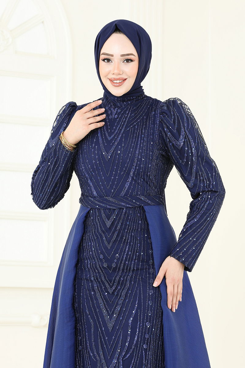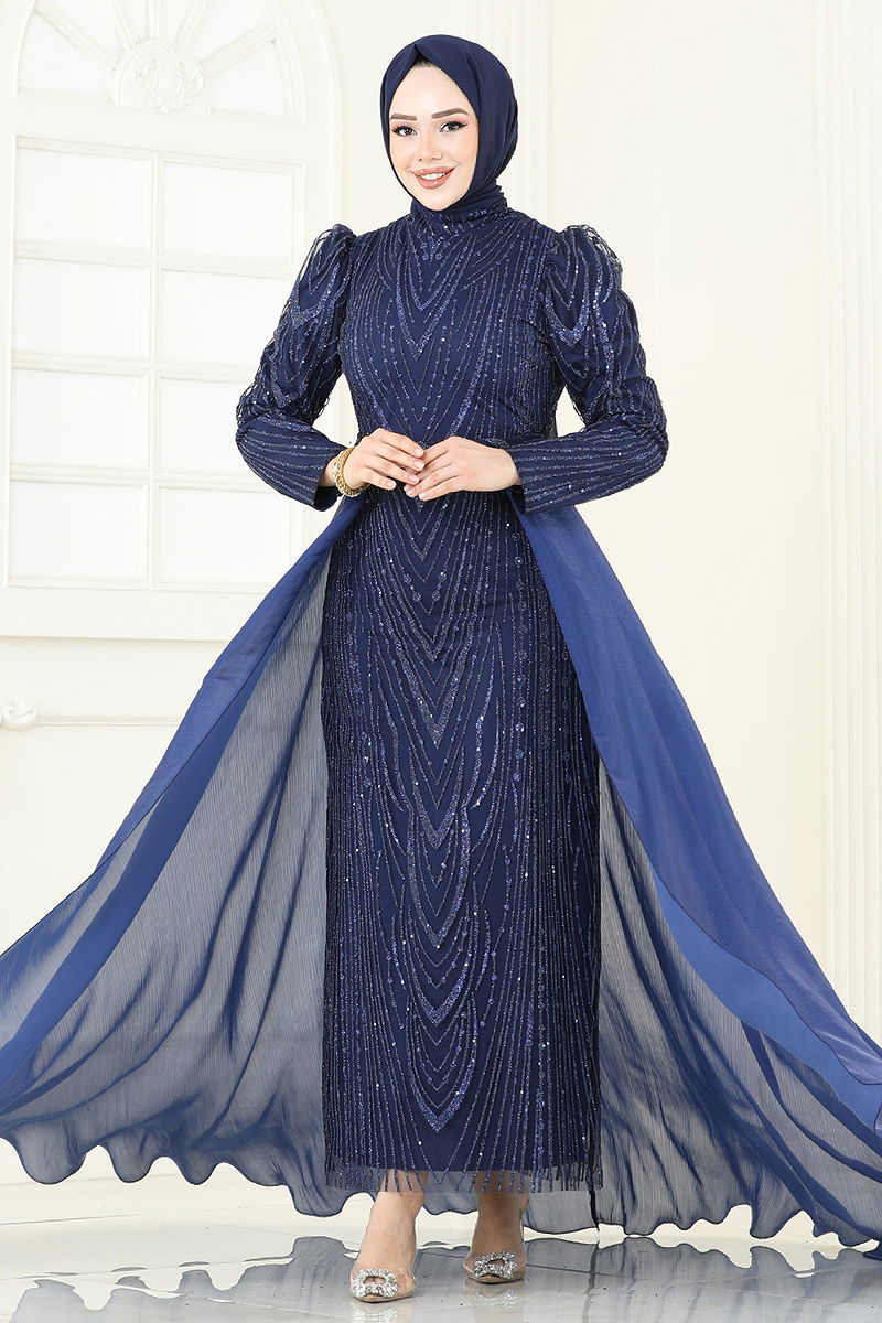 Elevate your elegance with the Cape-Detailed Glittery Evening Dress, suitable for wear in all four seasons. This modest dress is made from glittery tulle fabric and features a semi-mandarin collar and lining. The zippered back makes it easy to wear, and the chiffon cape detail offers a stunning look. Since the fabric is heavily glittered, shedding may occur; dry cleaning is recommended. The product model shown is a size 38.