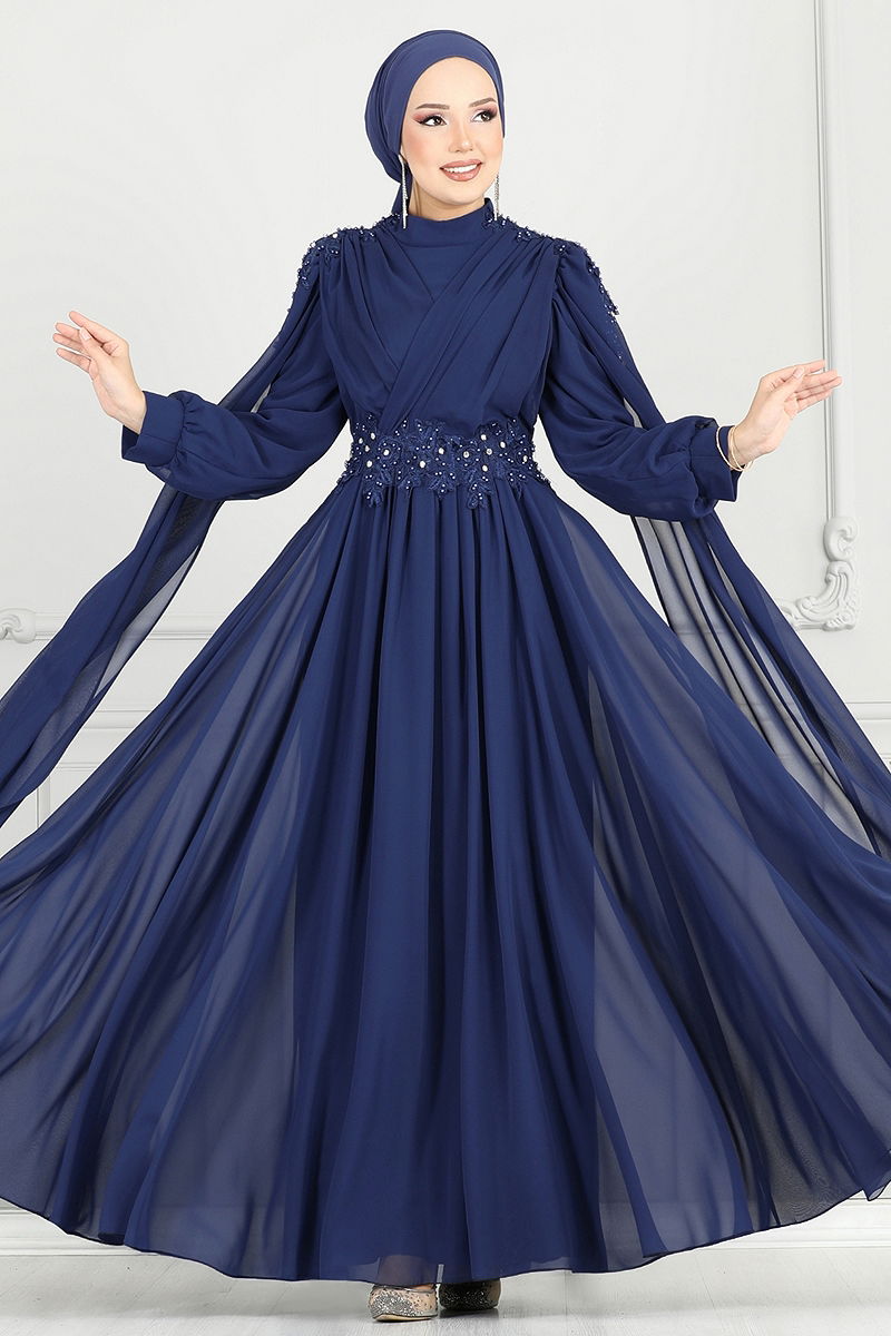 The Cape Dress with Lace Detailing is an elegant and glamorous choice that adds a modern twist to modest fashion. Suitable for wear in all seasons at any special event, this model offers comfort with its lightweight chiffon fabric. The lined design and stand collar combine sophistication, while the back zipper provides convenience. Elegant chiffon cape details, delicate lace embellishments, and sparkling stone and bead settings transform this garment into a stunning masterpiece. Recommended to be maintained by dry cleaning only, this piece promises to be one of the most special designs in your wardrobe.