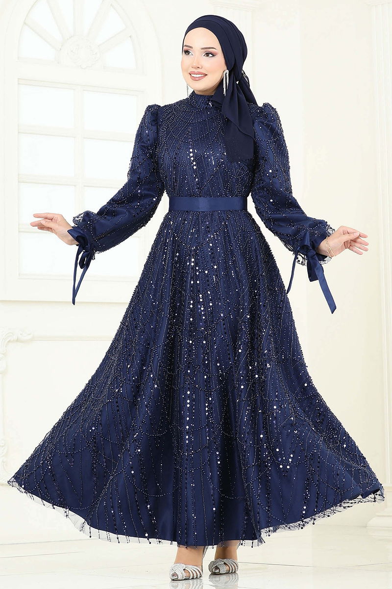 The Beaded Evening Gown is a special design that will complete your elegance in every season. Suitable for all-season use, this gown offers comfort with its lined satin fabric. Its high-neck and zipper-back design make it easy to wear. Dazzle with hand-sewn sequin details and printed beads. The included belt, specifically sewn to maintain its shape, can be optionally removed. This product, which should be dry cleaned, is an elegant choice for your special occasions.